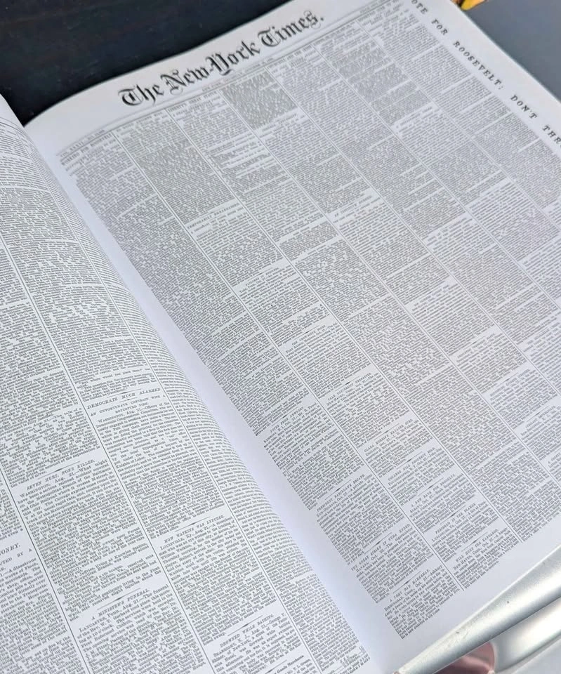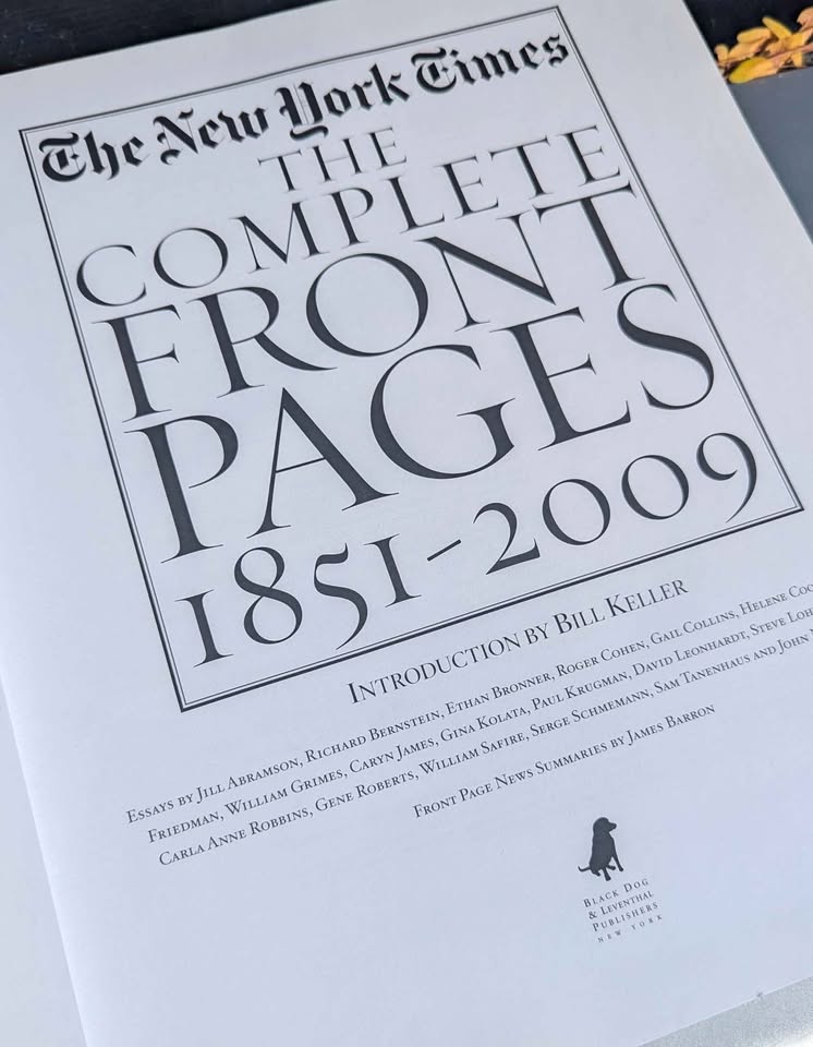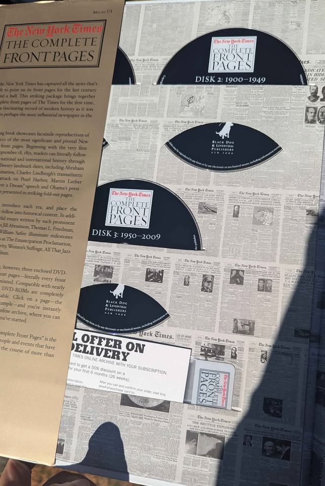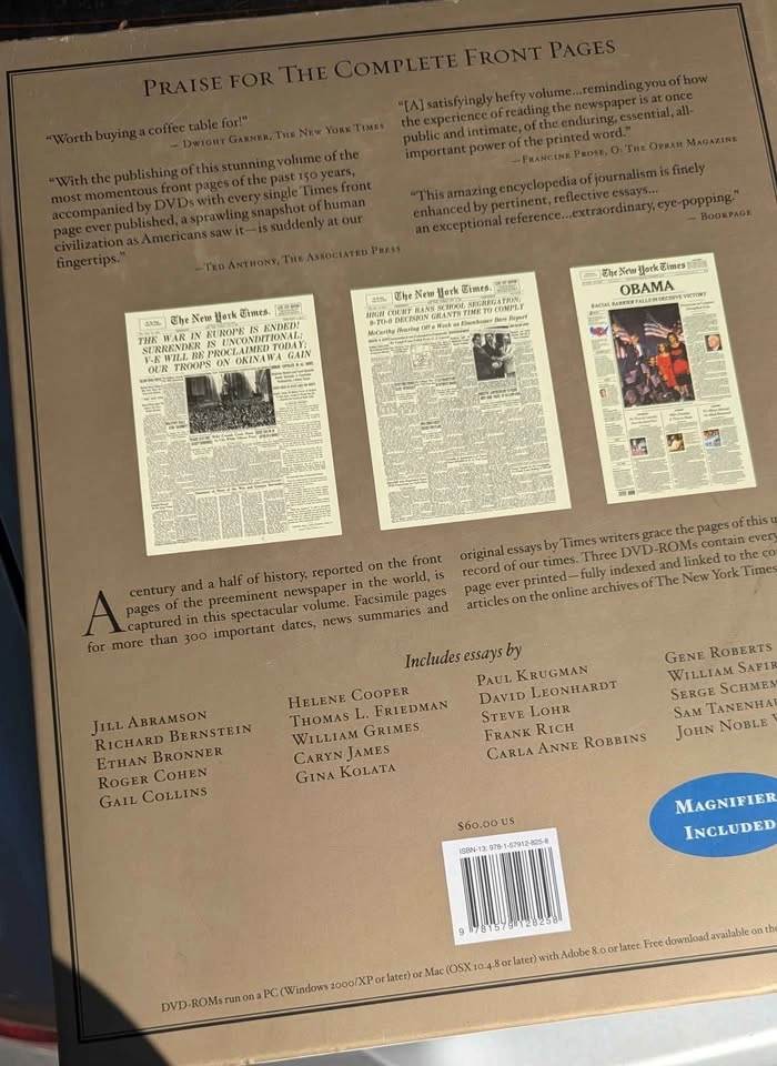 Massive collector’s edition compiling over 54,000 New York Times front pages from 1851 to 2009. Includes 3 original DVD-ROMs with full searchable archives and links to every article and magnifying glass. Oversized hardcover with gold dust jacket, essays by award-winning NYT journalists including Paul Krugman, Gail Collins, and Thomas Friedman.