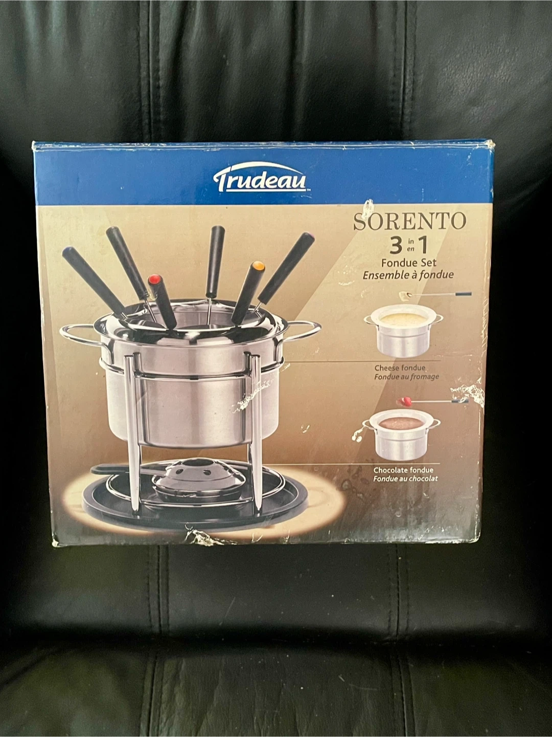 Selling a lightly used Trudeau Sorento 3 in 1 Fondue Set! It comes complete in its original box and includes all components. This set is perfect for cheese, chocolate, or other fondue creations. It features a stainless steel fork guide, stainless steel pot, chrome plated stand, safety burner, black metal tray, white stoneware double boiler insert, and 6 stainless steel fondue forks with colour coded tips. Use with gel fondue fuel only. Box is damaged.