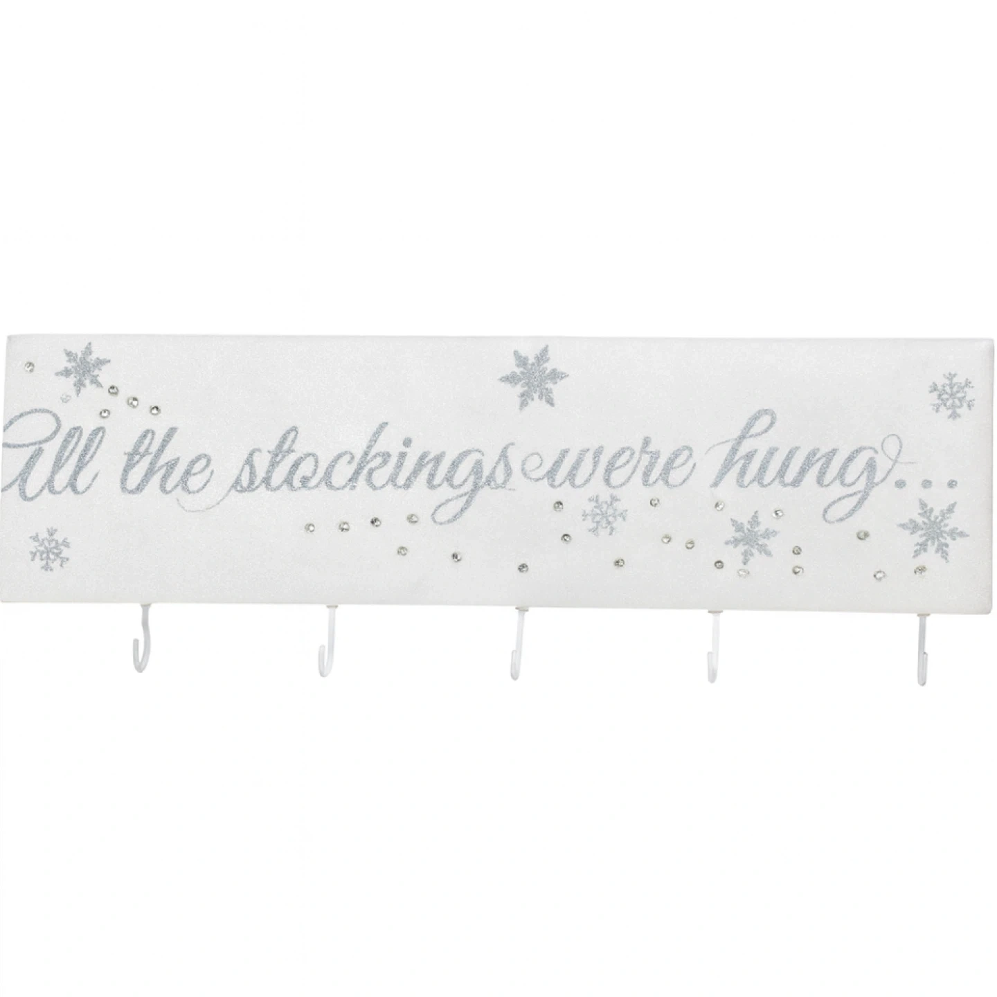 56Get ready for the holidays with this adorable stocking holder! It features the phrase "All the stockings were hung..." with snowflake accents and little hooks for hanging your stockings. Perfect for adding a touch of festive cheer to your home