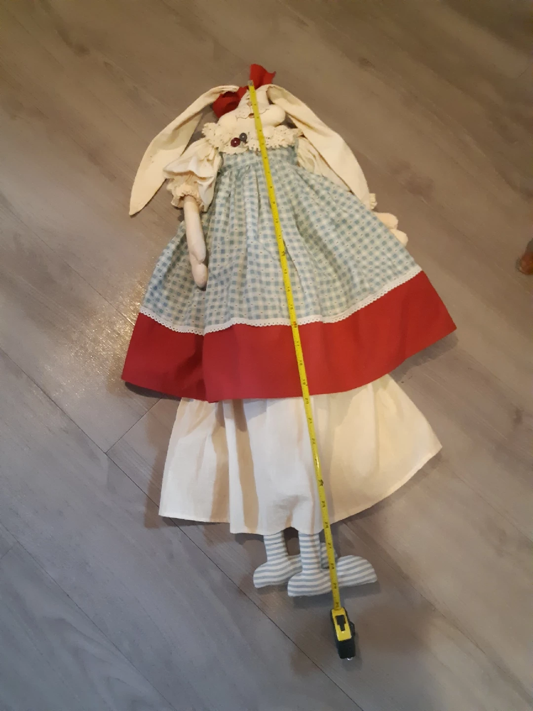 Two adorable handmade dolls by Diane! Vintage 1993 One is a sweet rabbit in a blue checkered dress, and the other is a charming cow with a red bandana. The rabbit doll measures approximately 30 inches in height. These dolls would make a lovely addition to any collection or a unique gift! CASH ONLY /PICKUP ONLY PLEASE/ FORESTLAWN S.E