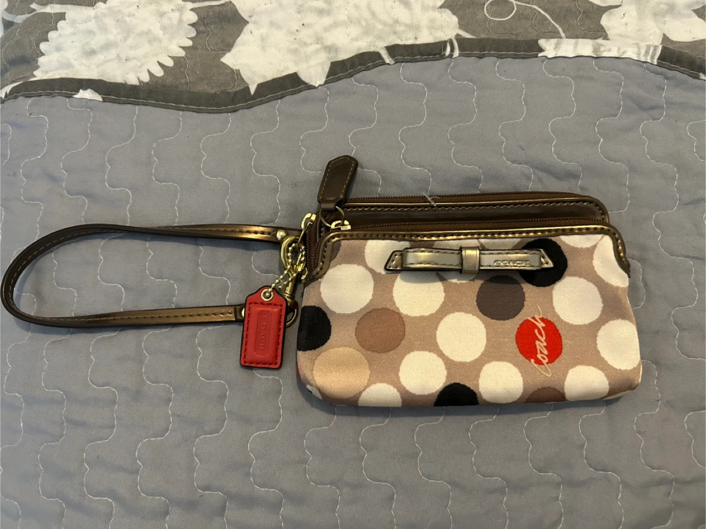 Selling a cute Coach wristlet featuring a fun polka dot design! It's in great condition and perfect for carrying your essentials when you're on the go. The wristlet has a convenient strap and a stylish look, small.