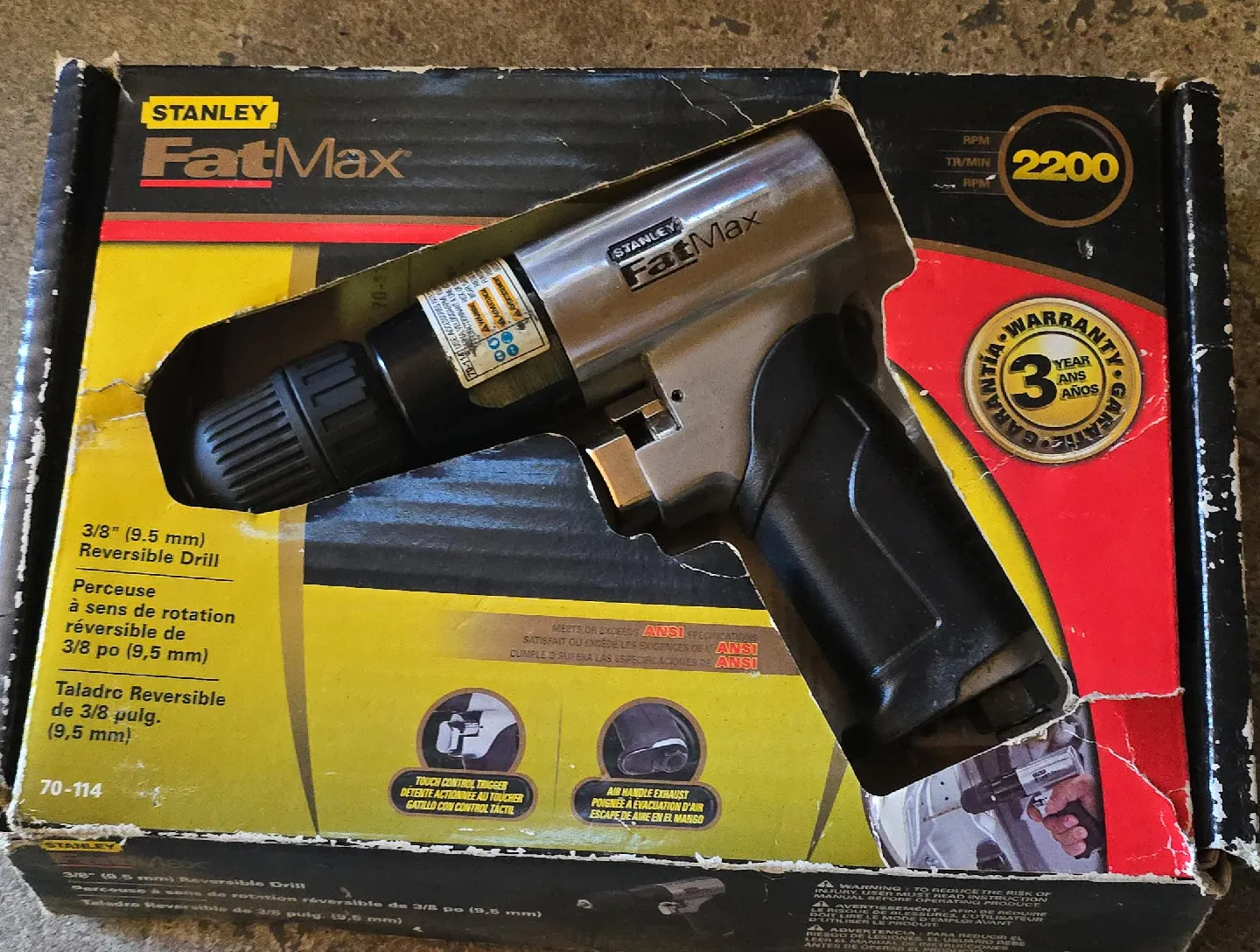 Selling a Stanley FatMax 3/8" reversible drill! It comes in its original box and has a touch control trigger. It also features an air handle exhaust. It meets or exceeds ANSI specifications