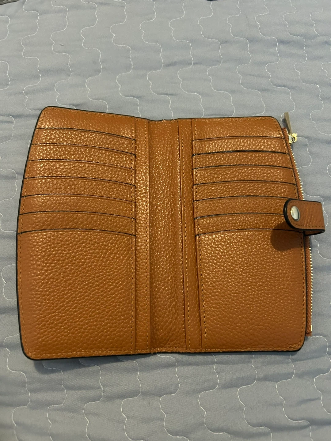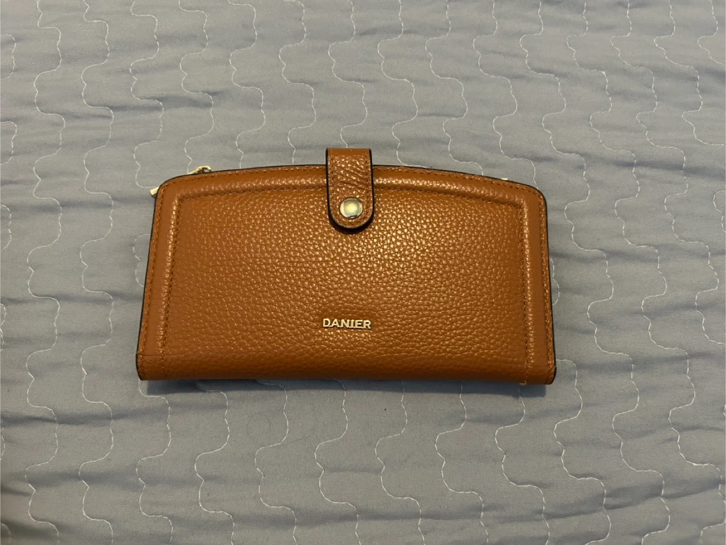 This is a brown leather wallet from Danier. It has a snap closure. Lots of space for cards and cash!