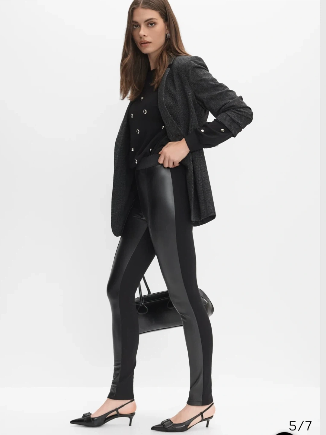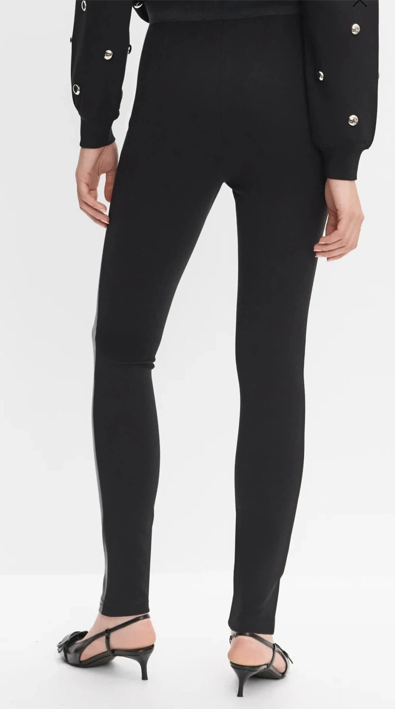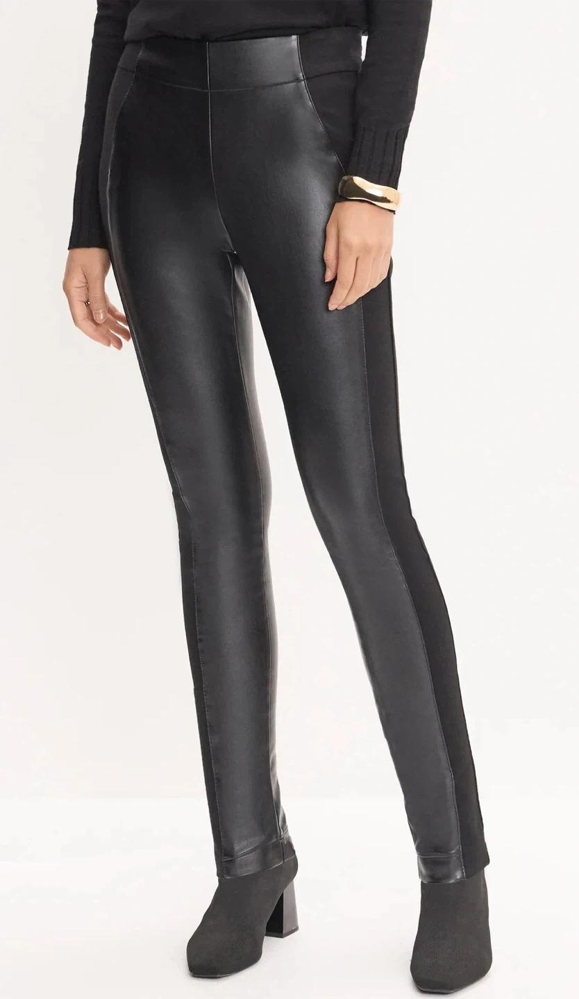 Designed with a faux leather front and a stretch fabric back, these leggings combine style and comfort — perfect for both day and night looks.