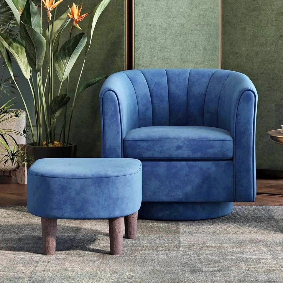 Premium velvet blue fabric swivel chair comes with a matching blue ottoman. The chair has a 360-degree swivel base and a pleated back design. Material is easy-maintenance velvet. Chair has a 300 lbs weight capacity and ottoman has a 250 lbs weight capacity.