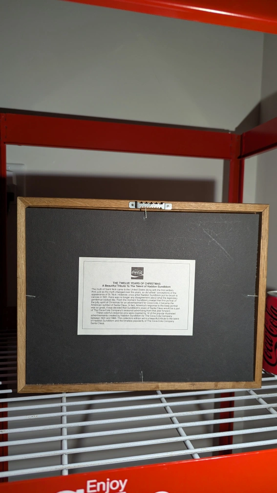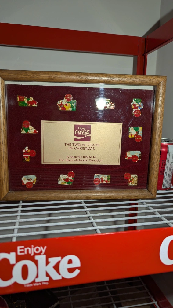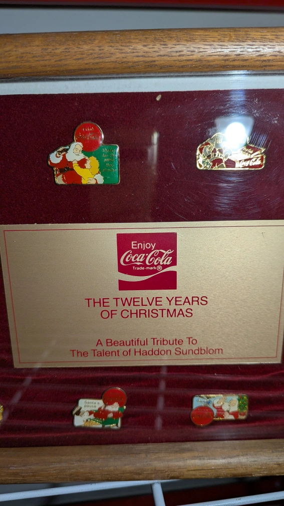 Here's a framed set of Coca-Cola pins commemorating the Twelve Years of Christmas. It's a beautiful tribute to the talent of Haddon Sundblom, the artist behind many iconic Coca-Cola Santa images. A great piece for any Coca-Cola collector! 1931 to 1966 illustrations used.