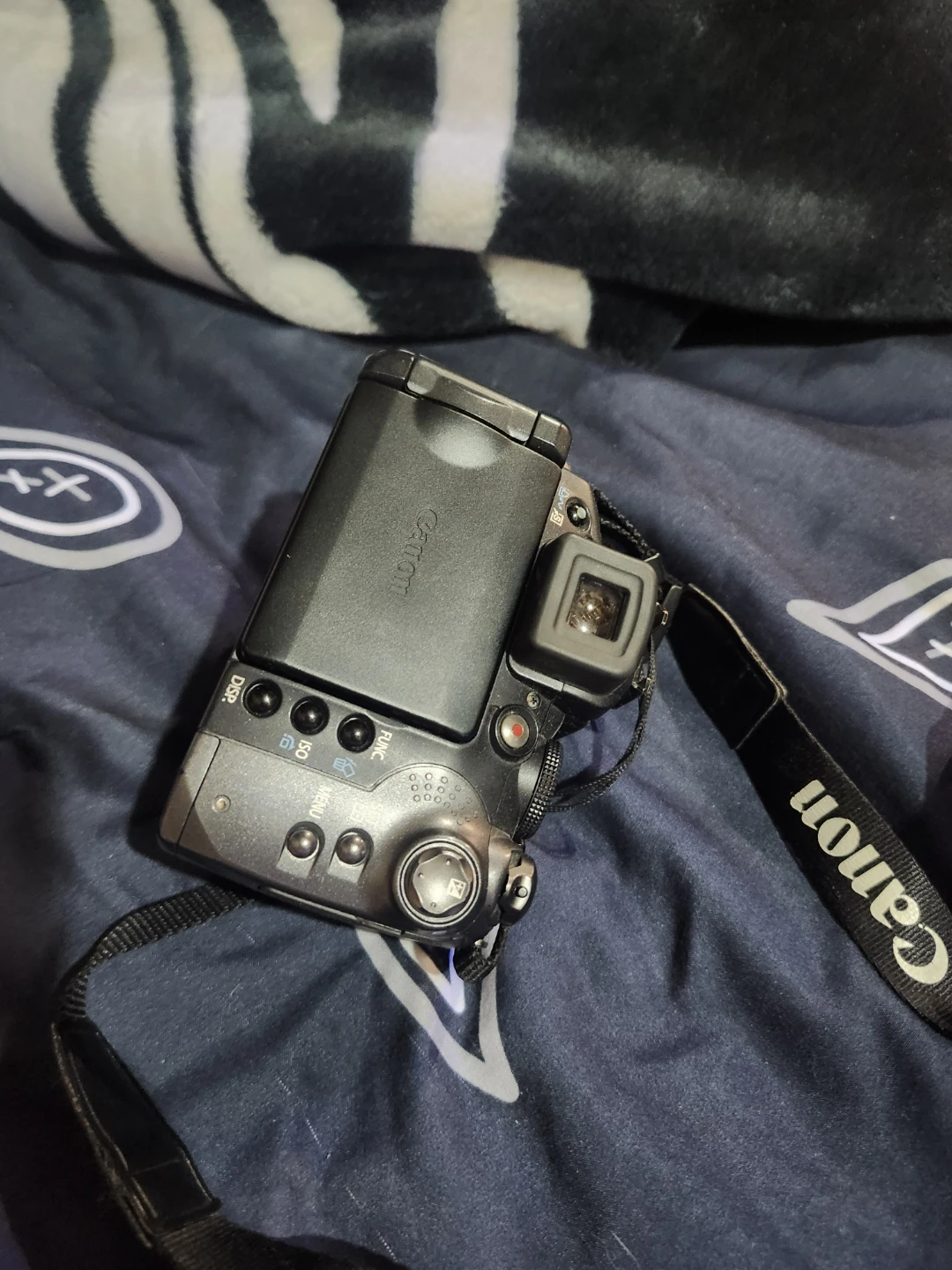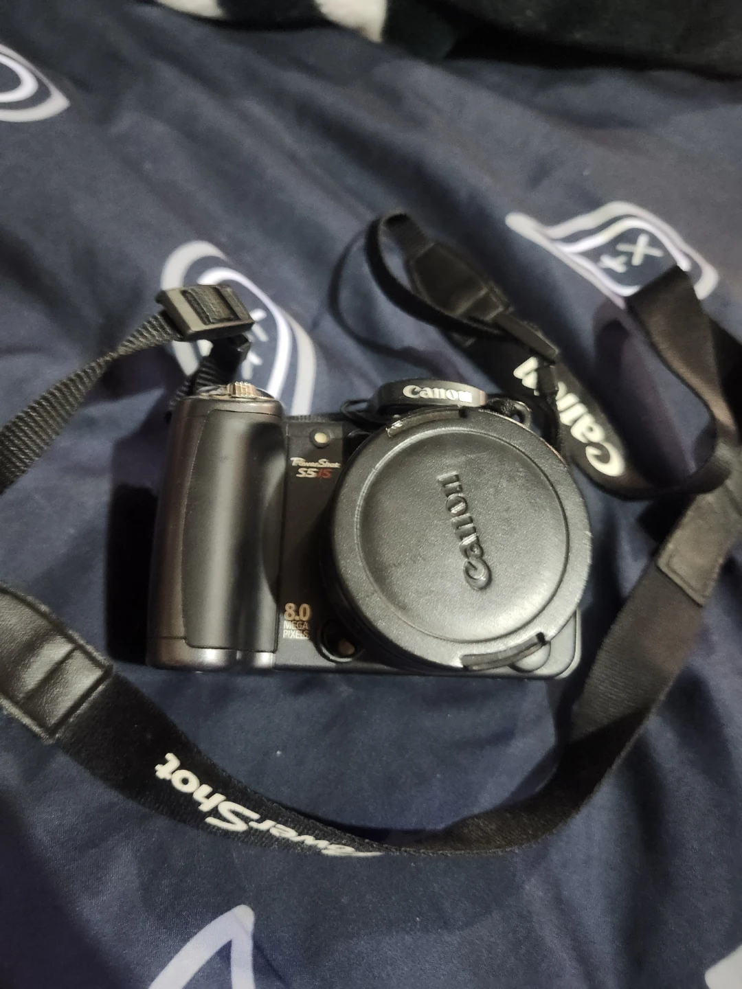 This is a Canon PowerShot SD350 digital camera. It features an 8.0-megapixel sensor. The camera is black and comes with its original strap. It's a good choice for everyday snapshots!