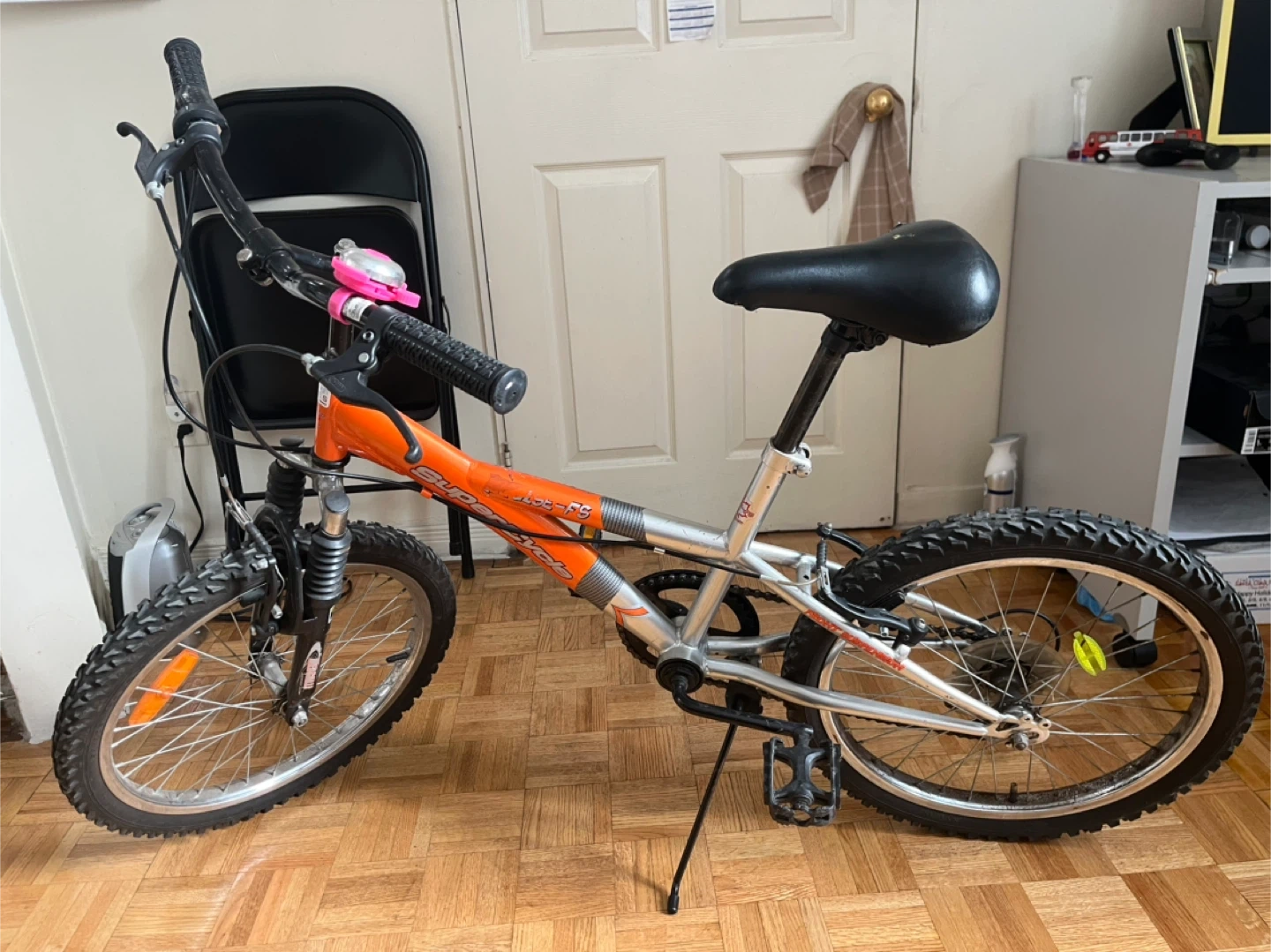 This is a SuperCycle Impulse FS bike with a 5-speed gear system. It features front suspension for a smoother ride. The bike has an orange frame with silver accents. Perfect for kids learning to ride or for casual neighbourhood trips!