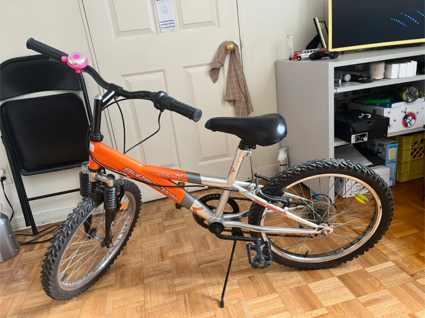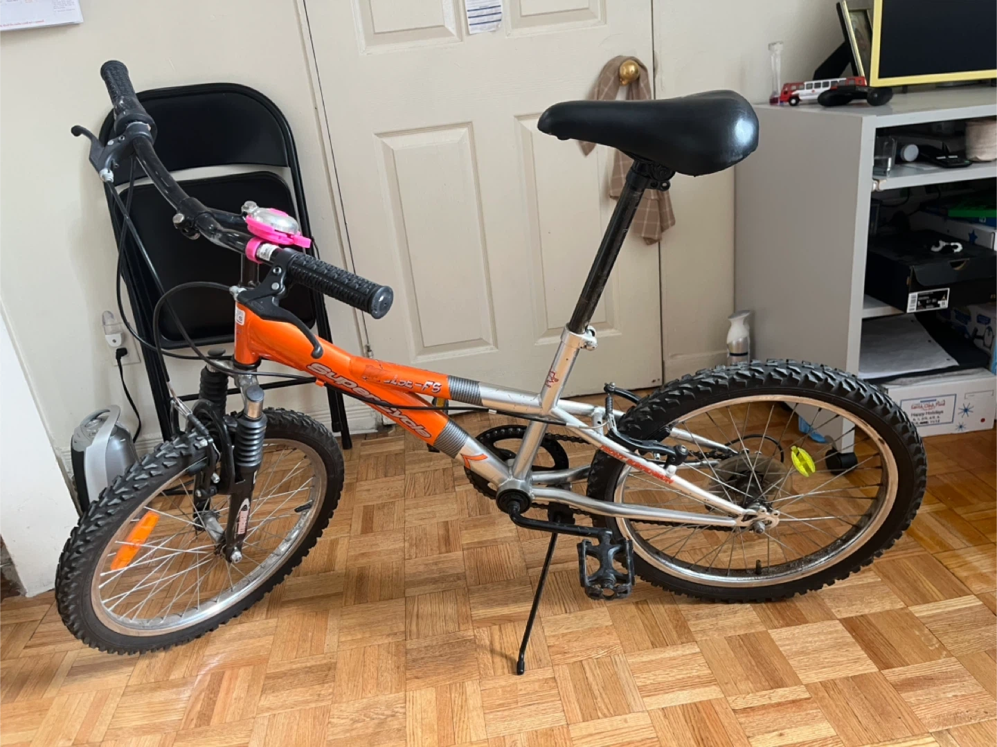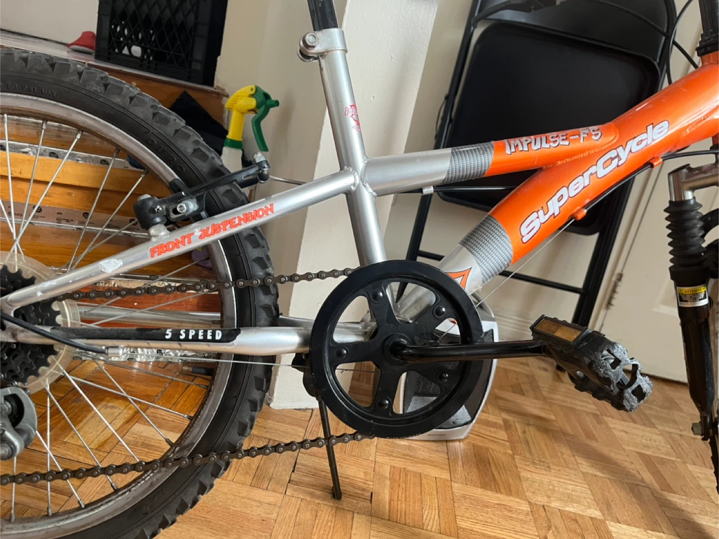 This is a SuperCycle Impulse FS bike with a 5-speed gear system. It features front suspension for a smoother ride. The bike has an orange frame with silver accents. Perfect for kids learning to ride or for casual neighbourhood trips!