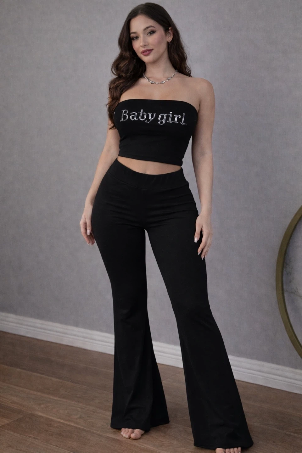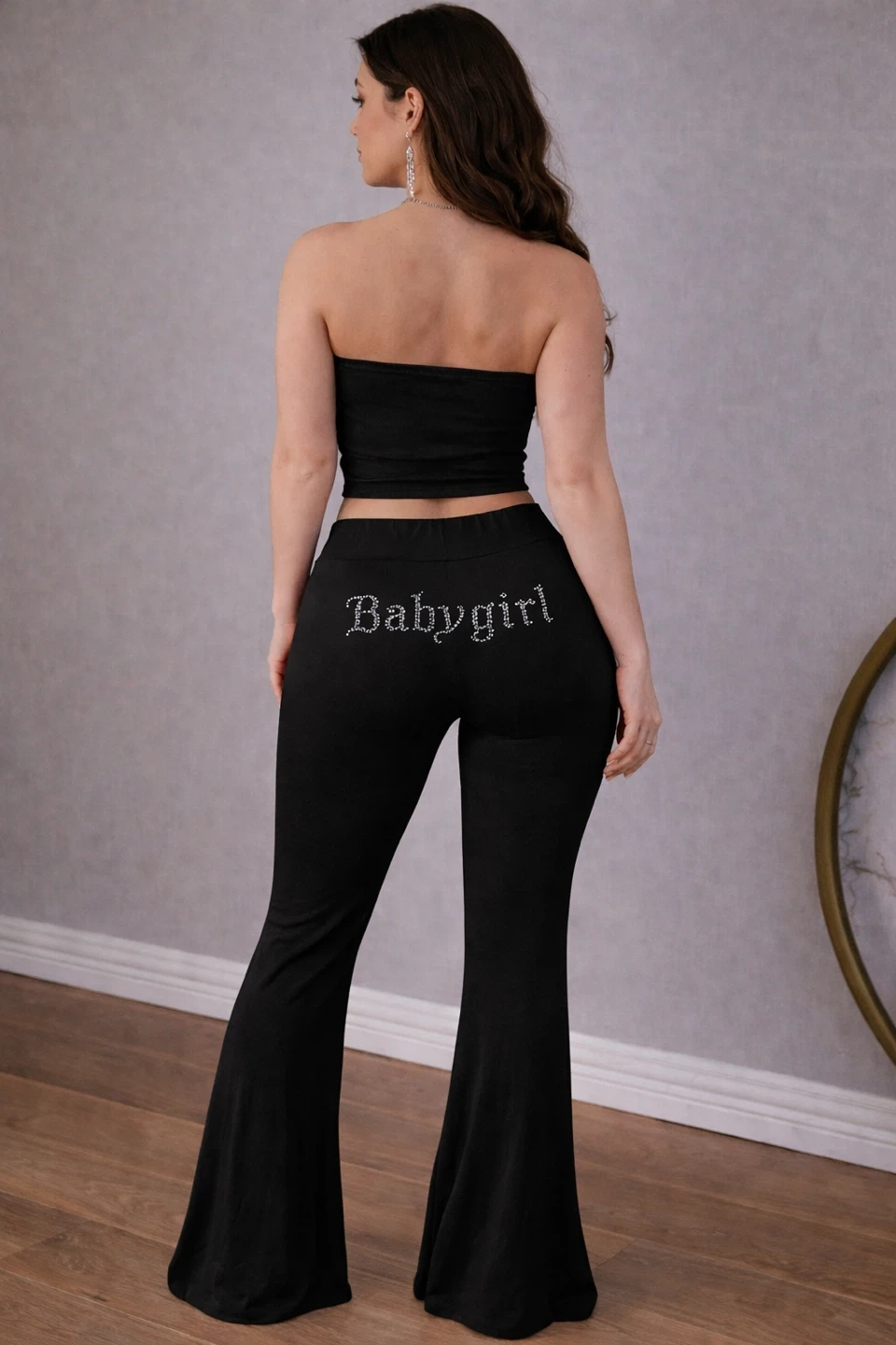 Black "Babygirl" Rhinestone Tube Top & Flare Pants Set