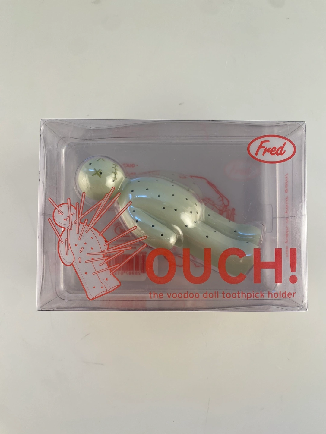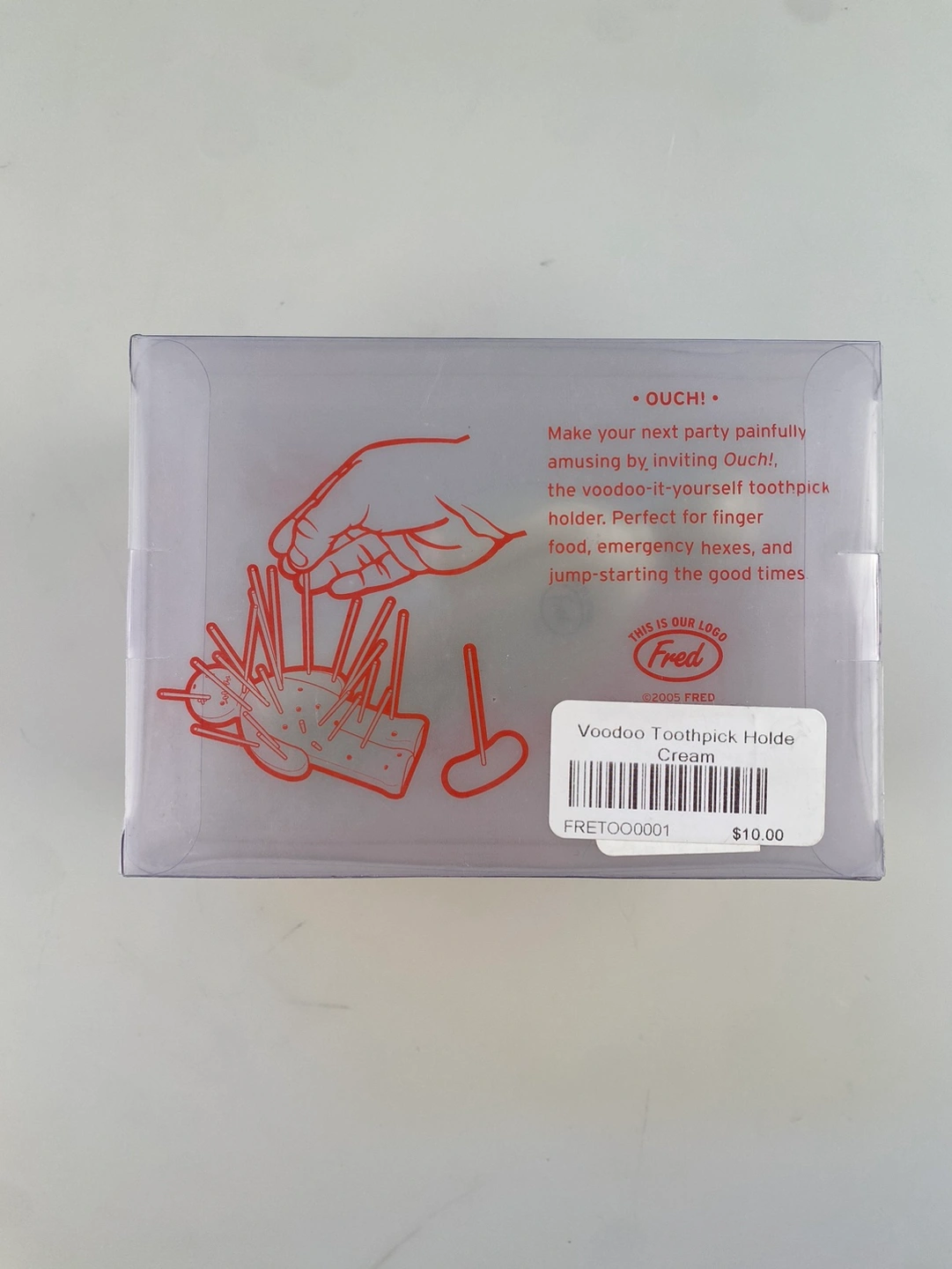 From the box: OUCH! Make your next party painfully amusing by inviting OUCH! The voodoo-it-yourself toothpick holder. Perfect for finger food, emergency hexes, and jump-starting the good times.