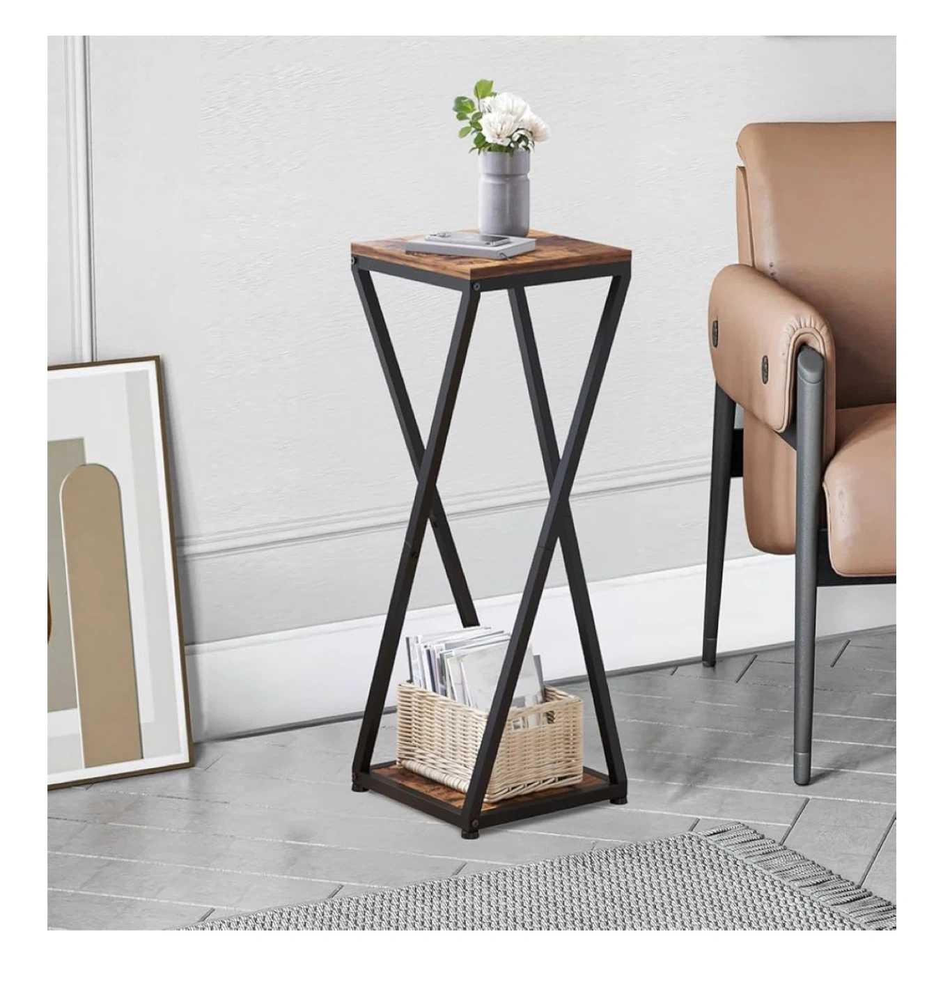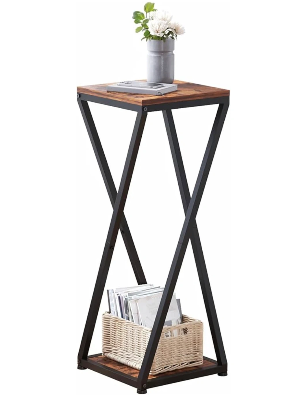 This rustic brown end table features a sturdy and durable metal frame. It's a space-saving design, perfect for displaying items or keeping things organized. The table is designed to keep balance and adds a corner upgrade to any room. It also includes a basket for extra storage