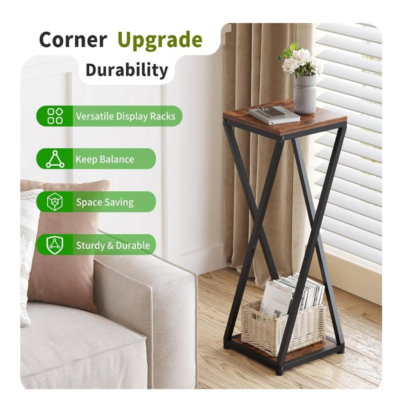 This rustic brown end table features a sturdy and durable metal frame. It's a space-saving design, perfect for displaying items or keeping things organized. The table is designed to keep balance and adds a corner upgrade to any room. It also includes a basket for extra storage
