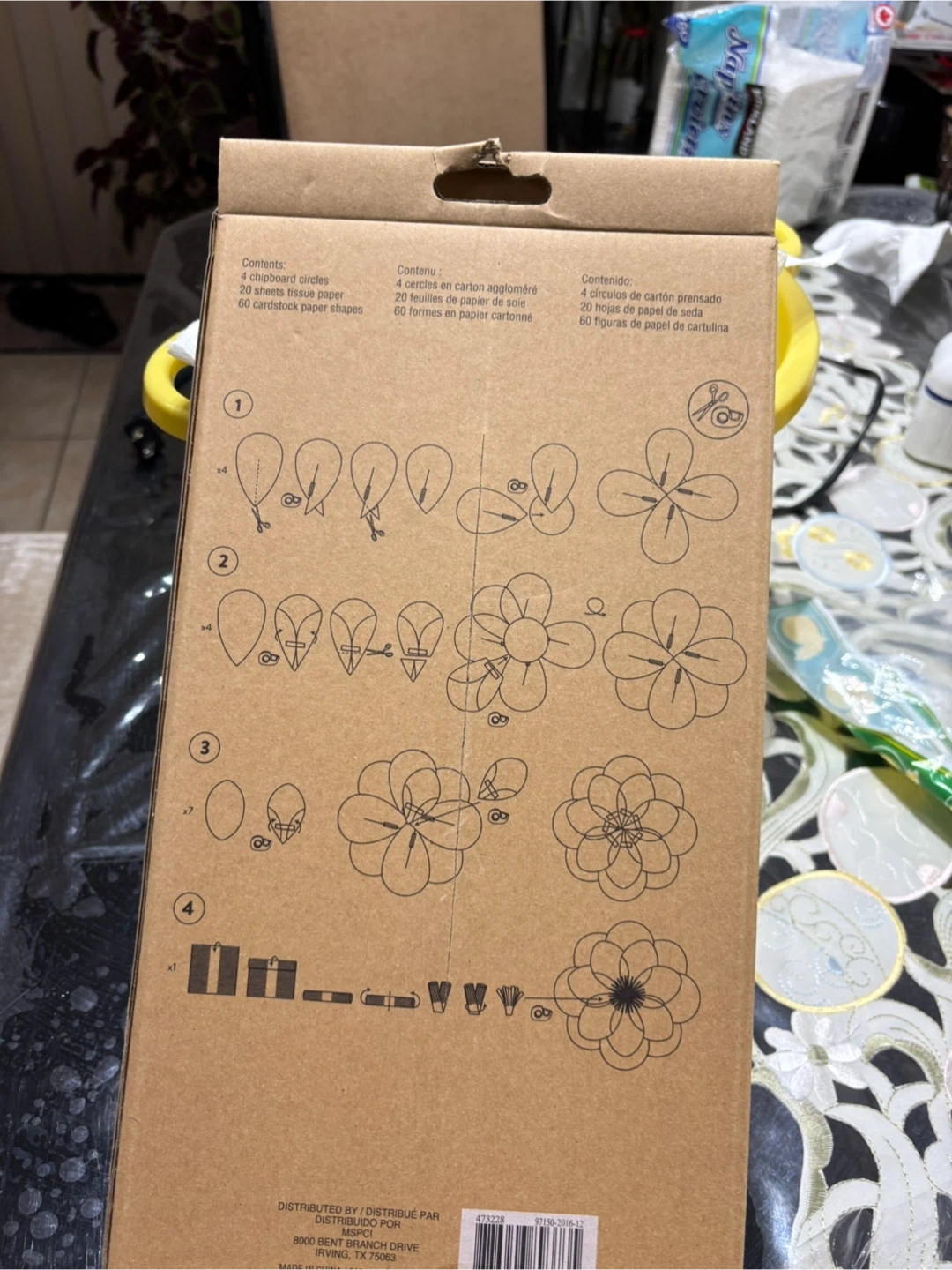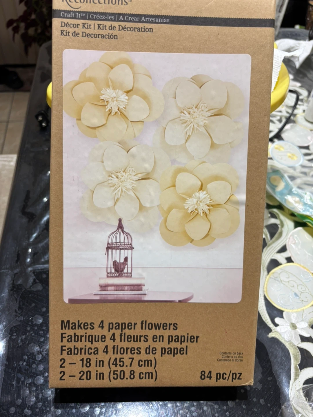 This kit makes 4 paper flowers in two sizes: 2-18 inches (45.7 cm) and 2-20 inches (50.8 cm). It contains 84 pieces. They're great for adding a decorative touch to parties or rooms!