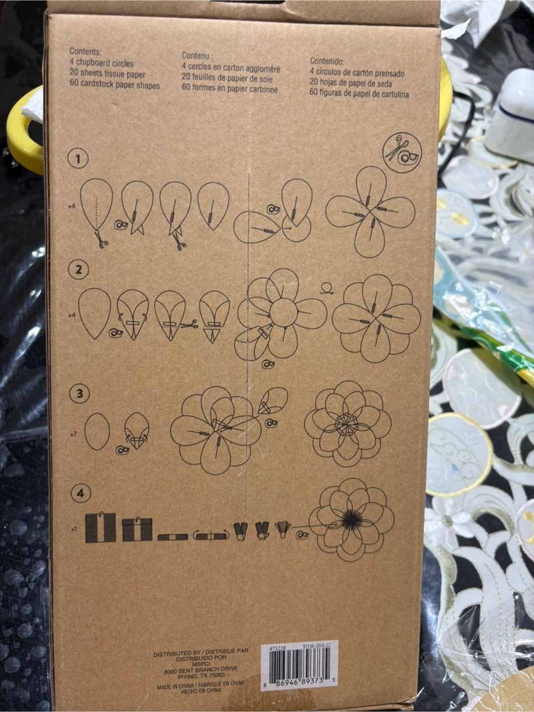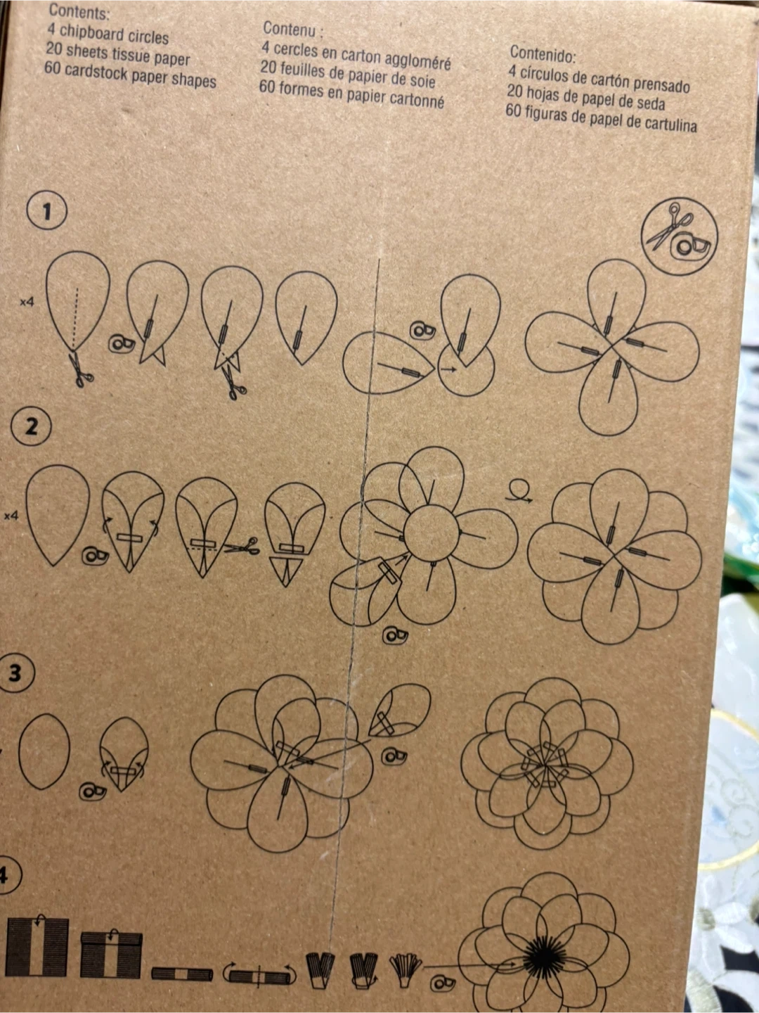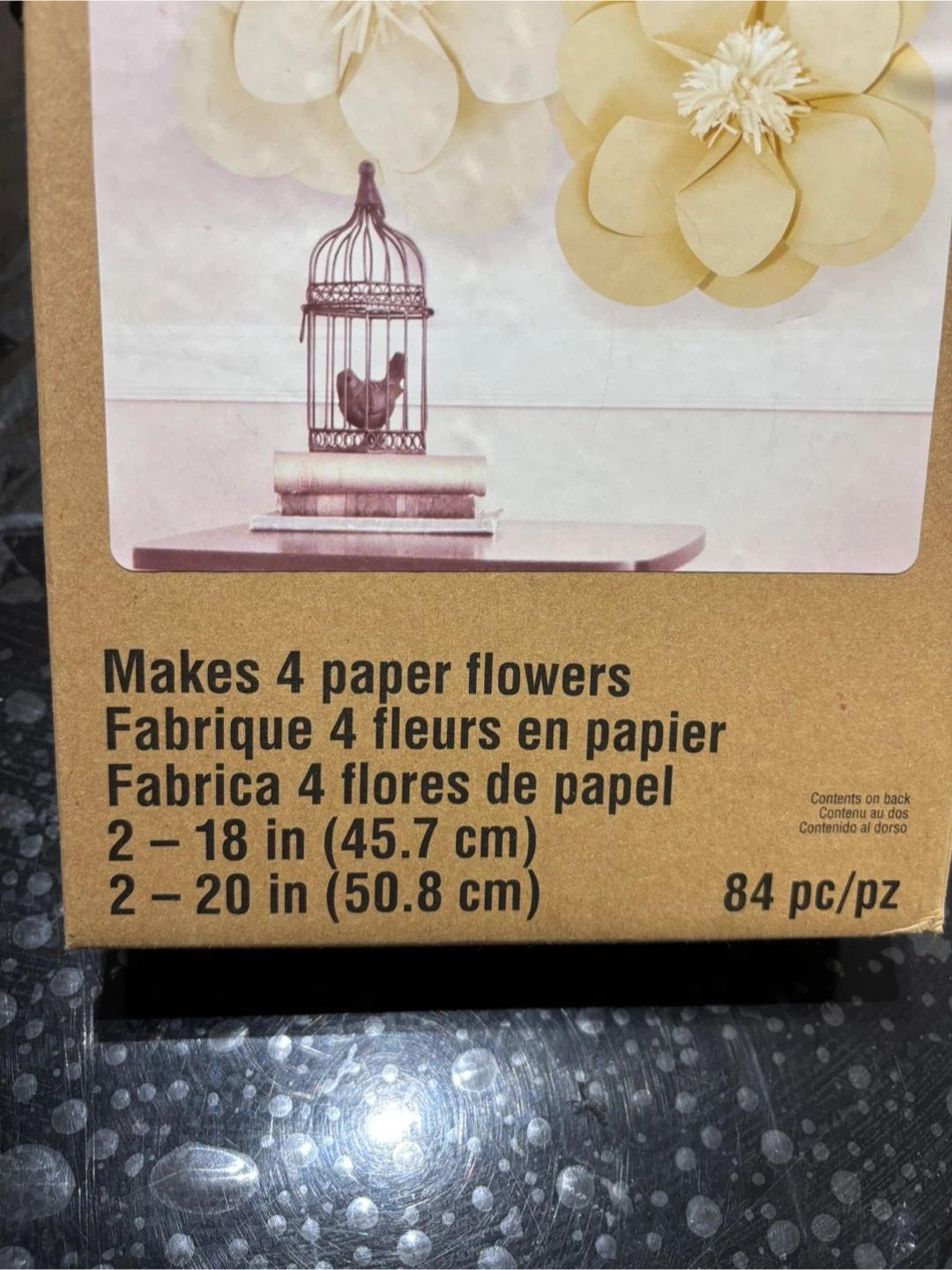 This kit makes 4 paper flowers in two sizes: 2-18 inches (45.7 cm) and 2-20 inches (50.8 cm). It contains 84 pieces. They're great for adding a decorative touch to parties or rooms!