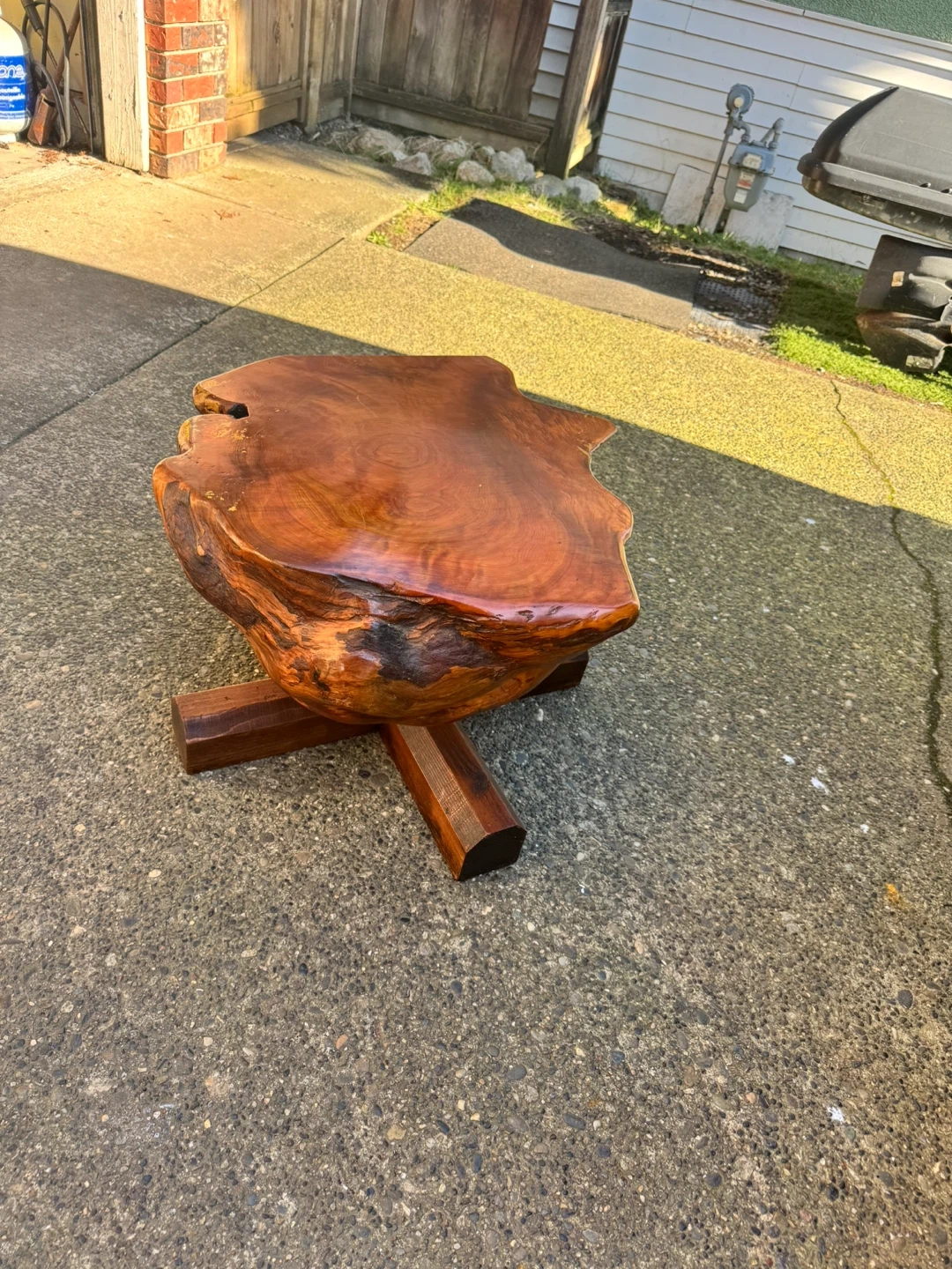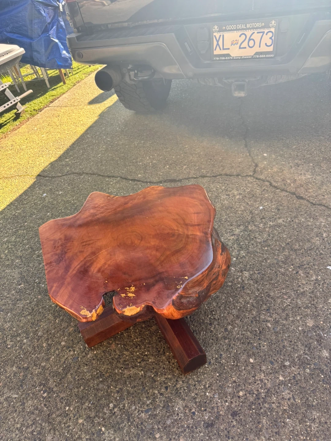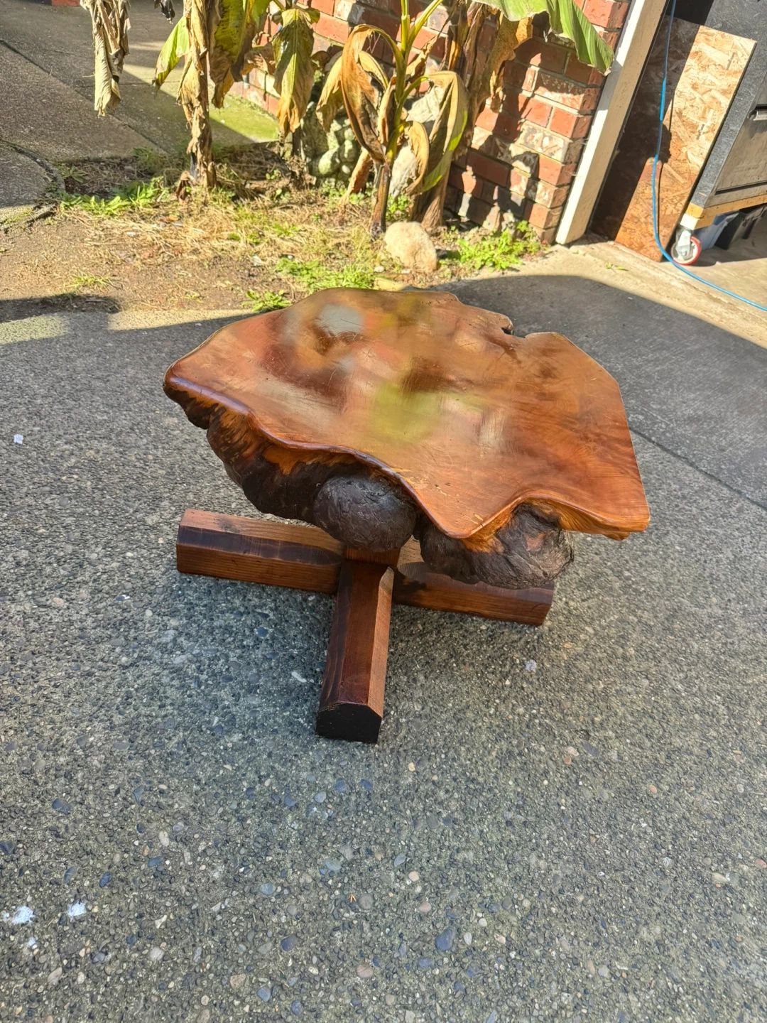 Handcrafted coffee table made from a natural live edge wood slab. It features a unique, organic shape and a rich, polished finish. Supported by a sturdy wooden base, it's a beautiful statement piece for any living room. Wood material.