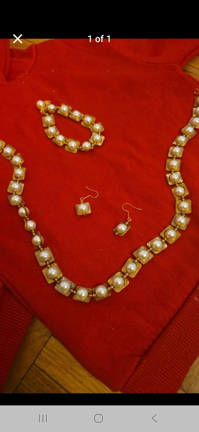 This is a three-piece jewelry set featuring a necklace, bracelet, and a pair of earrings. Each piece showcases faux pearl beads interspersed with decorative gold-toned square accents. It's a classic combination for any occasion!