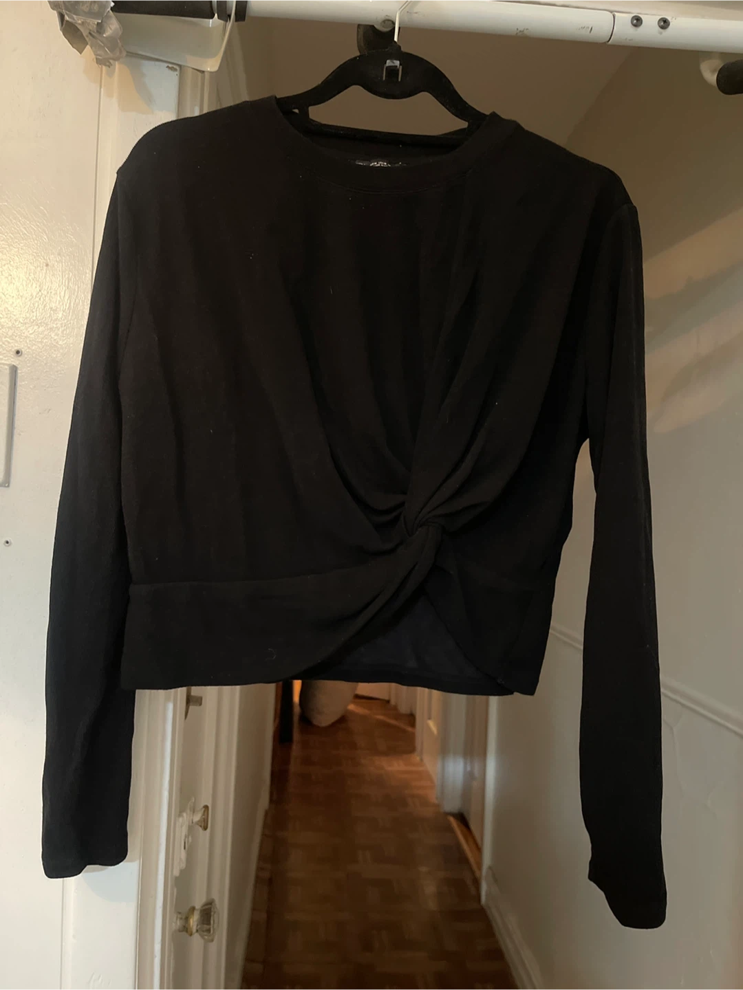 Selling a black long sleeve top with a stylish twist front design. It's in great condition and ready for a new owner!