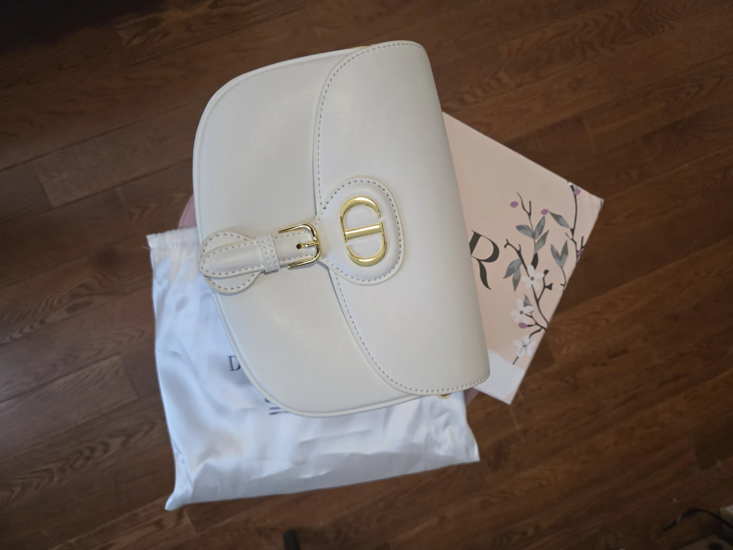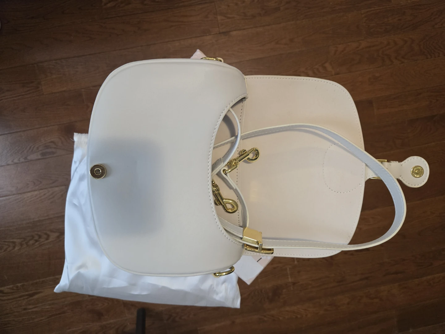 A stylish white leather handbag with gold-tone hardware. It's designed with a secure flap closure and an adjustable strap. This bag is a great accessory for everyday use.