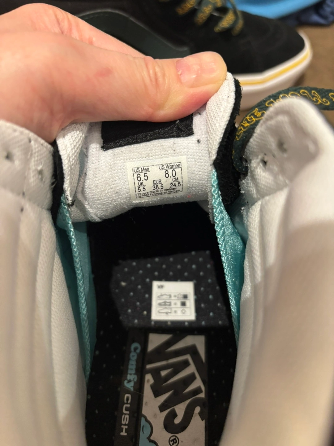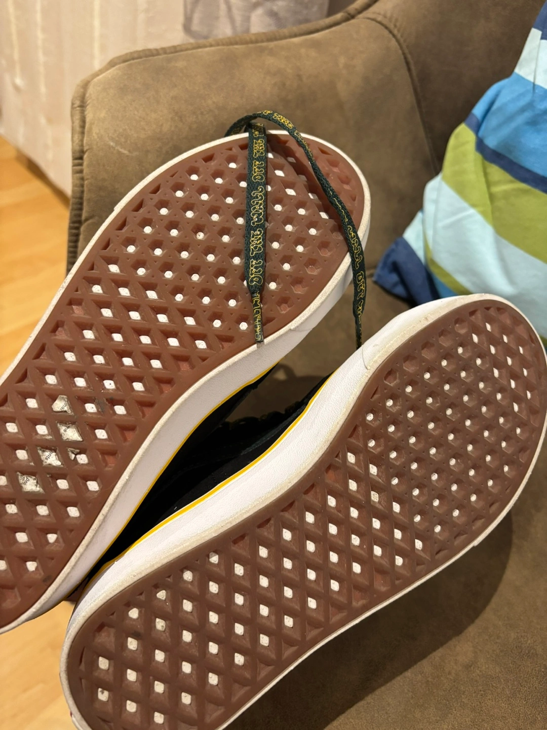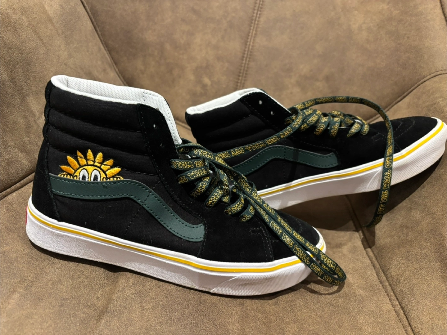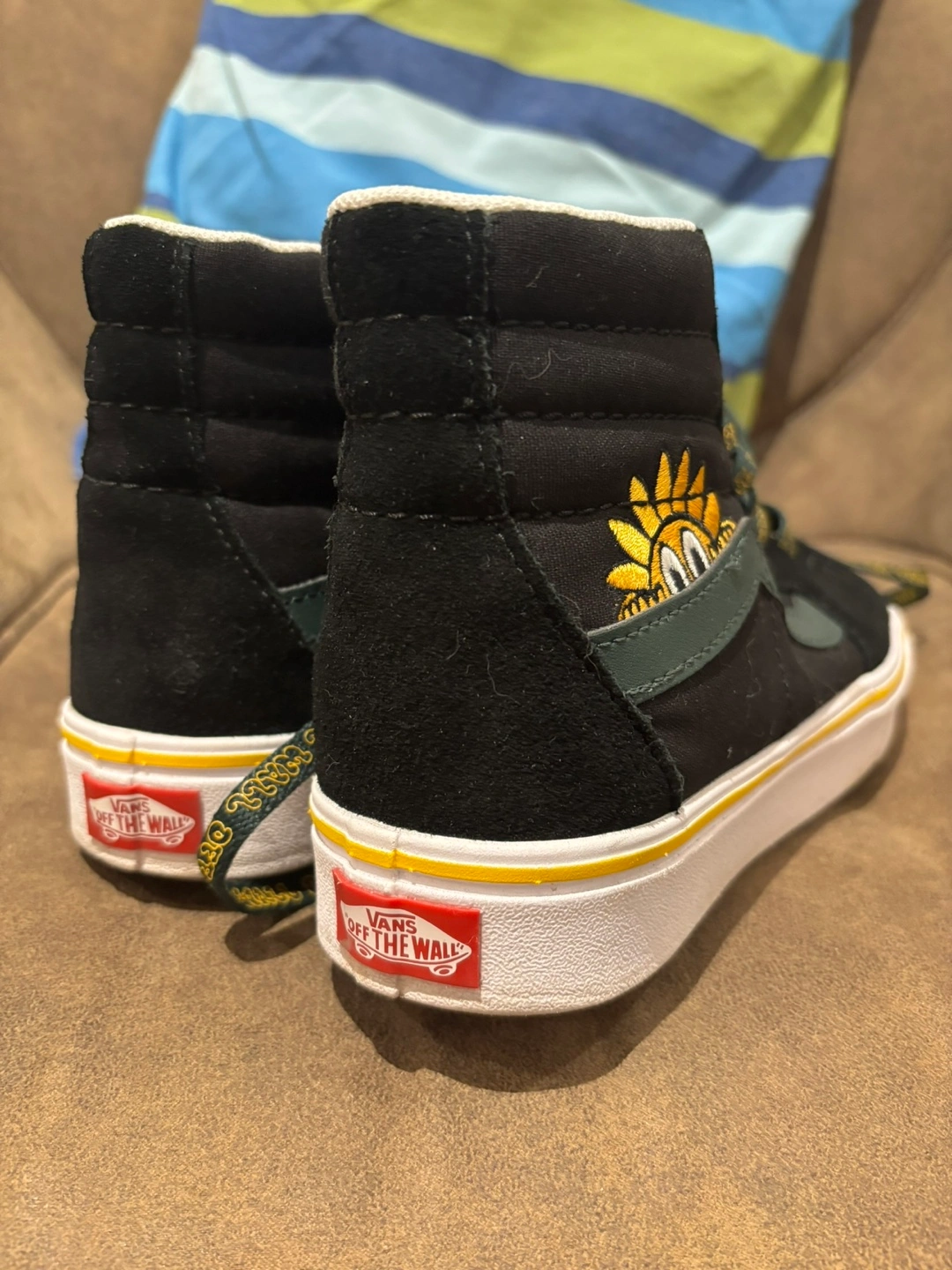 Selling a pair of Vans Sk8-Hi shoes with a cool sunflower design! They're black with green accents and a white sole. The size is US men's 6.5, which is a women's 8. The soles have some wear, but overall they're in good shape and ready for a new home