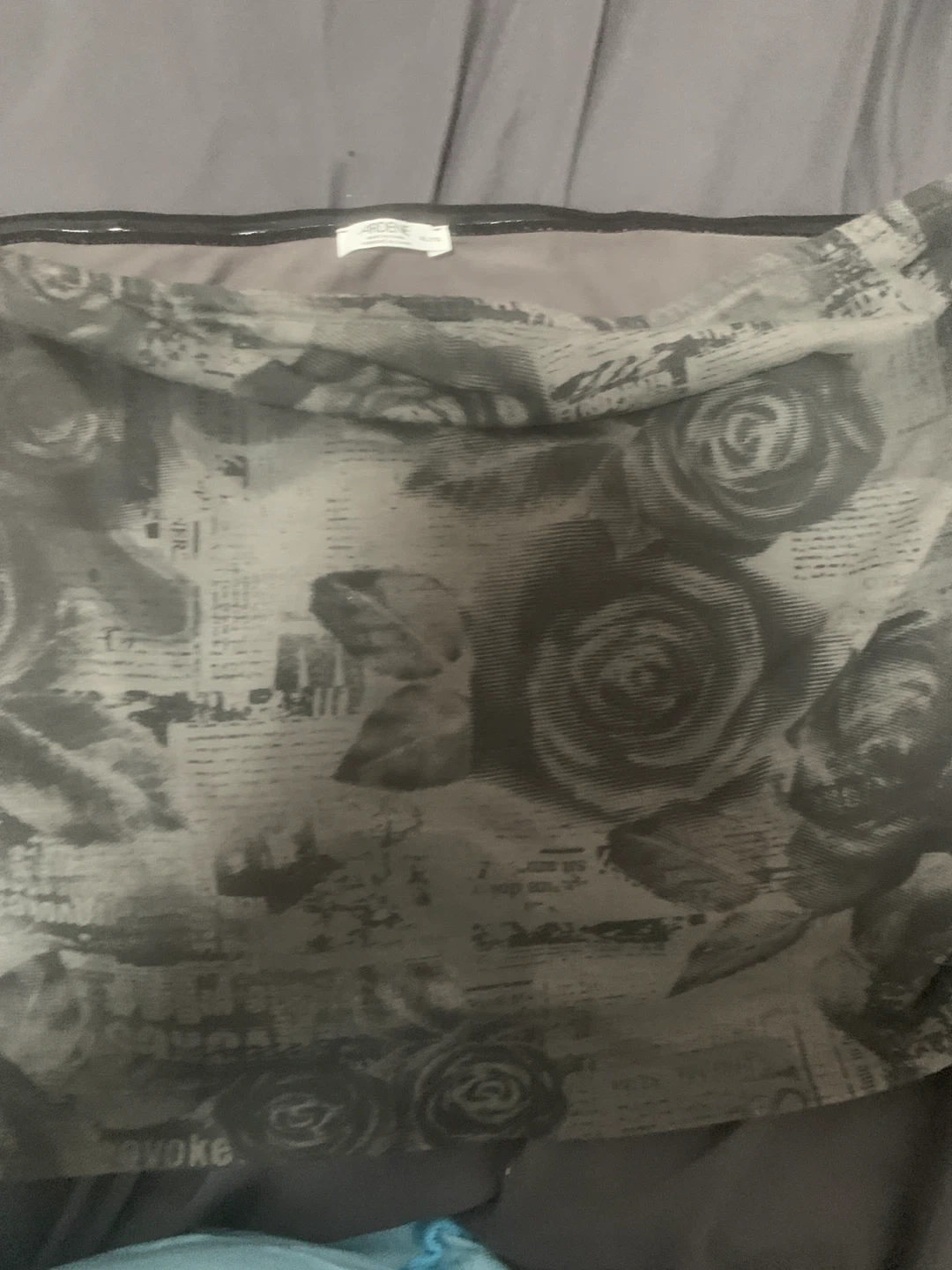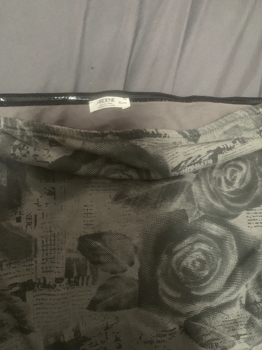 in size X/TG! It features a newspaper and rose print. Perfect for adding a touch of unique style to your wardrobe
