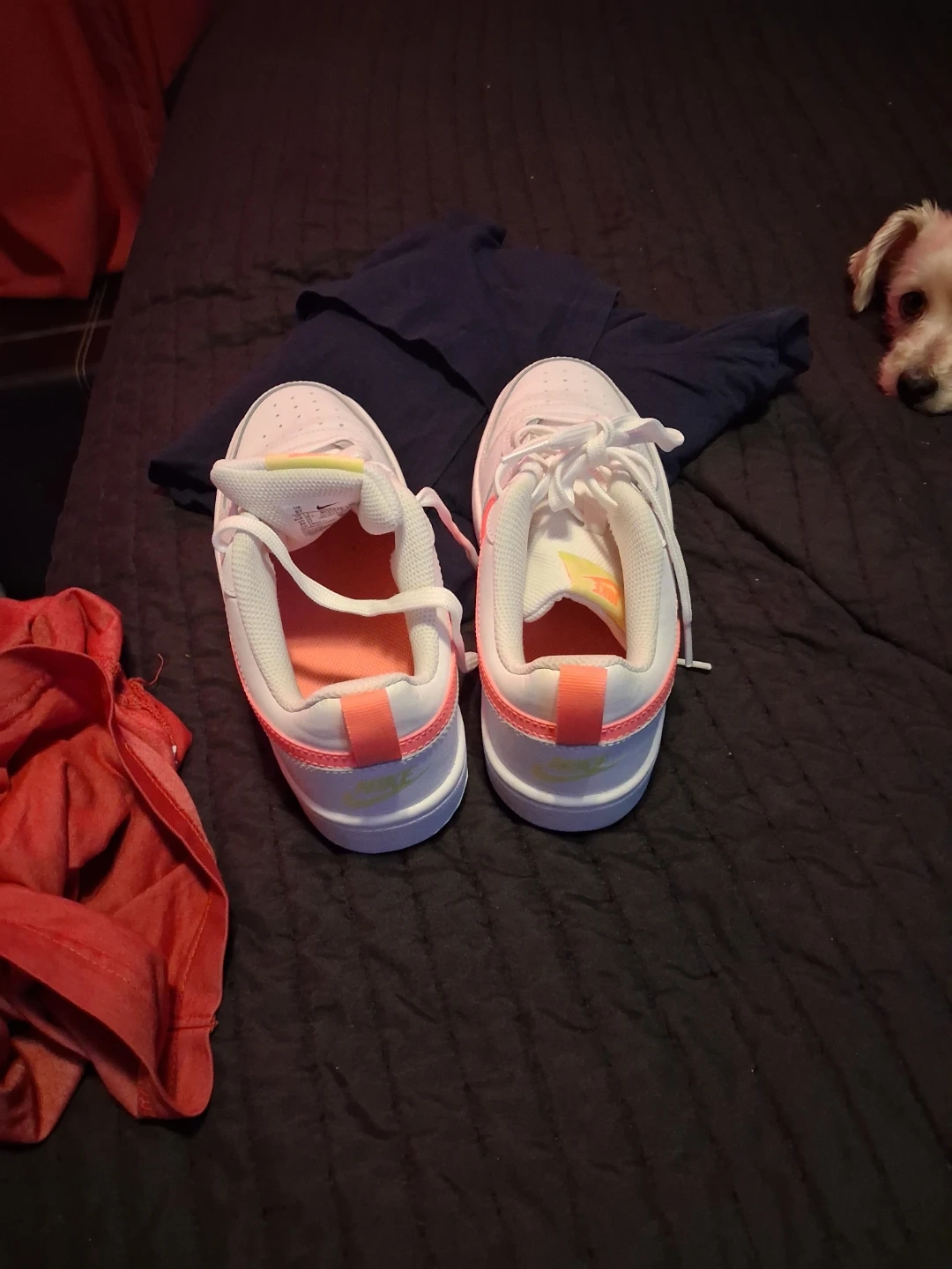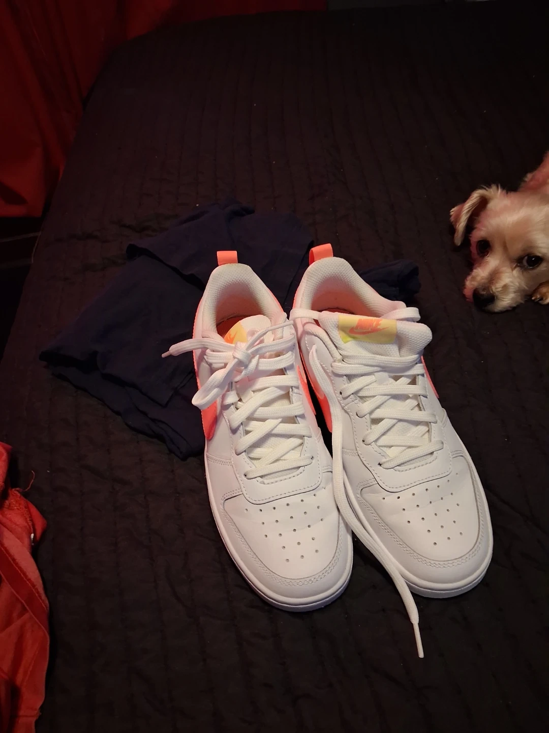 Classic Nike Court Vision Low sneakers. White leather with coral pink swoosh and accents. Lace-up closure. Comfortable for everyday wear. Size 6 youth