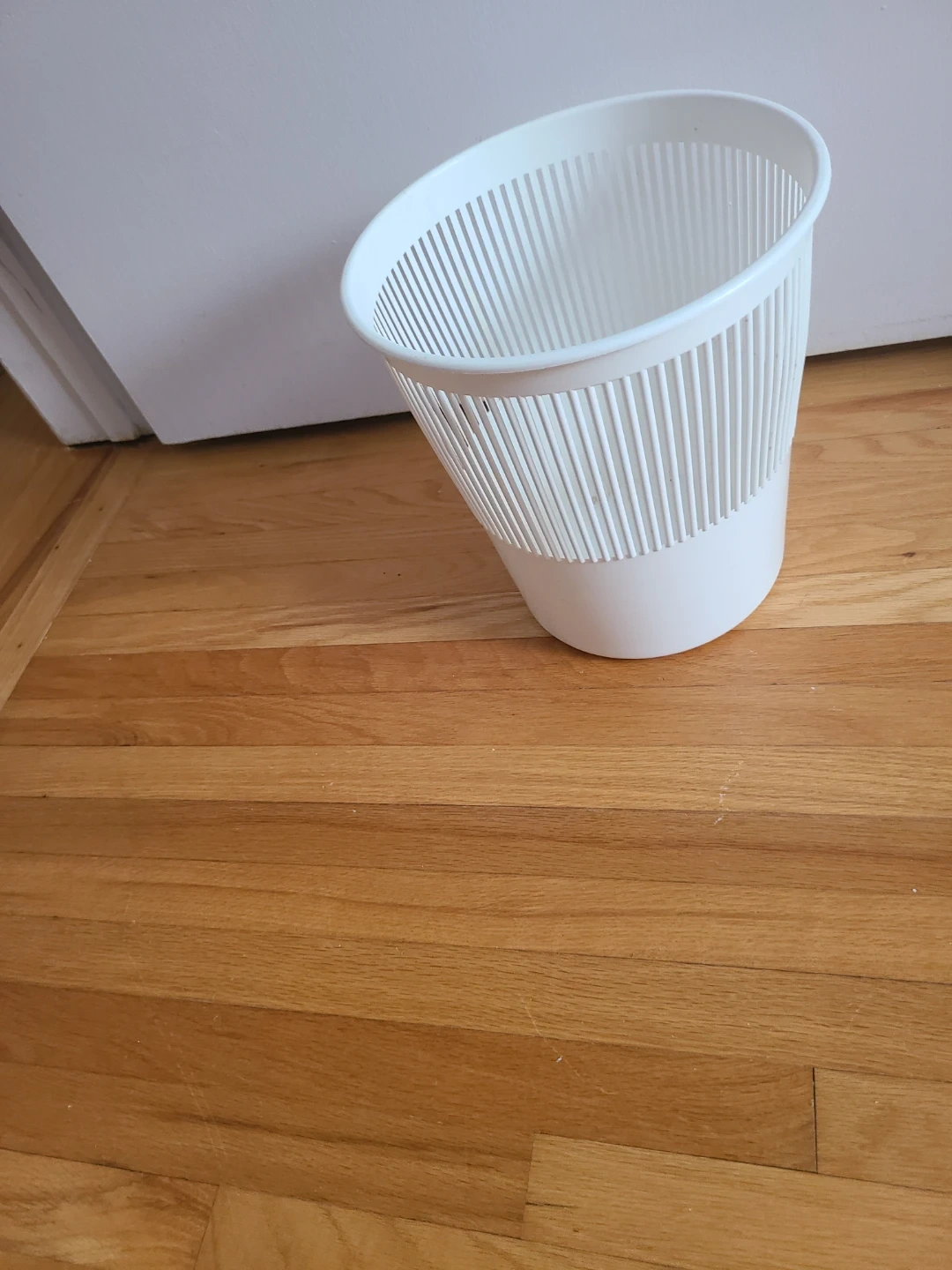 A simple white waste bin with a perforated design. It's made of plastic and has an open top. This bin is useful for any room.