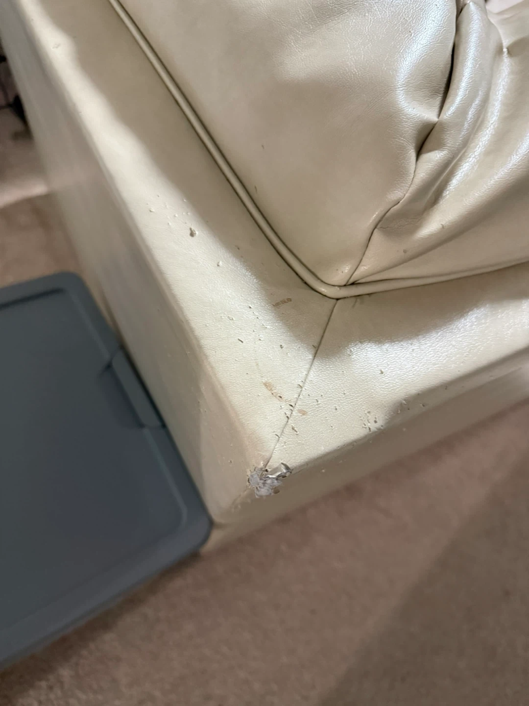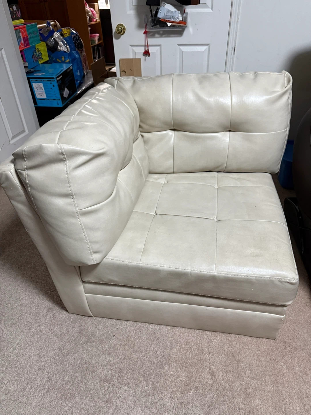 Cream coloured corner chair with a faux leather finish. There's some wear and tear on the corners. It's a comfy addition to any living space.