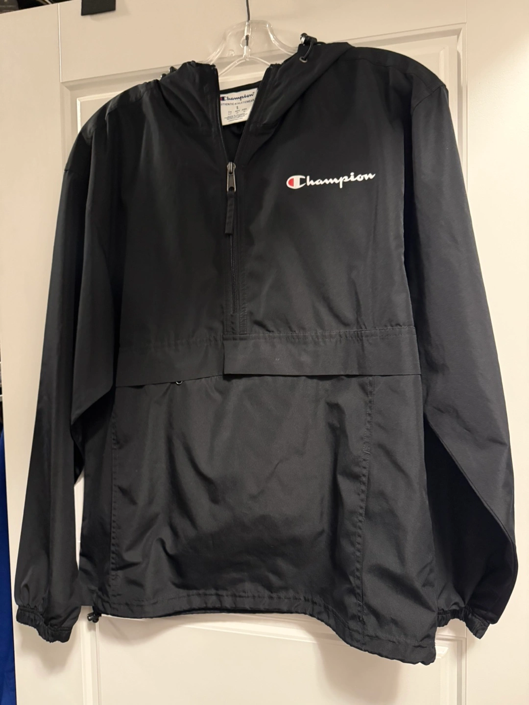 Black Champion pullover jacket. Adult Size small. Features a half-zip closure and a hood.