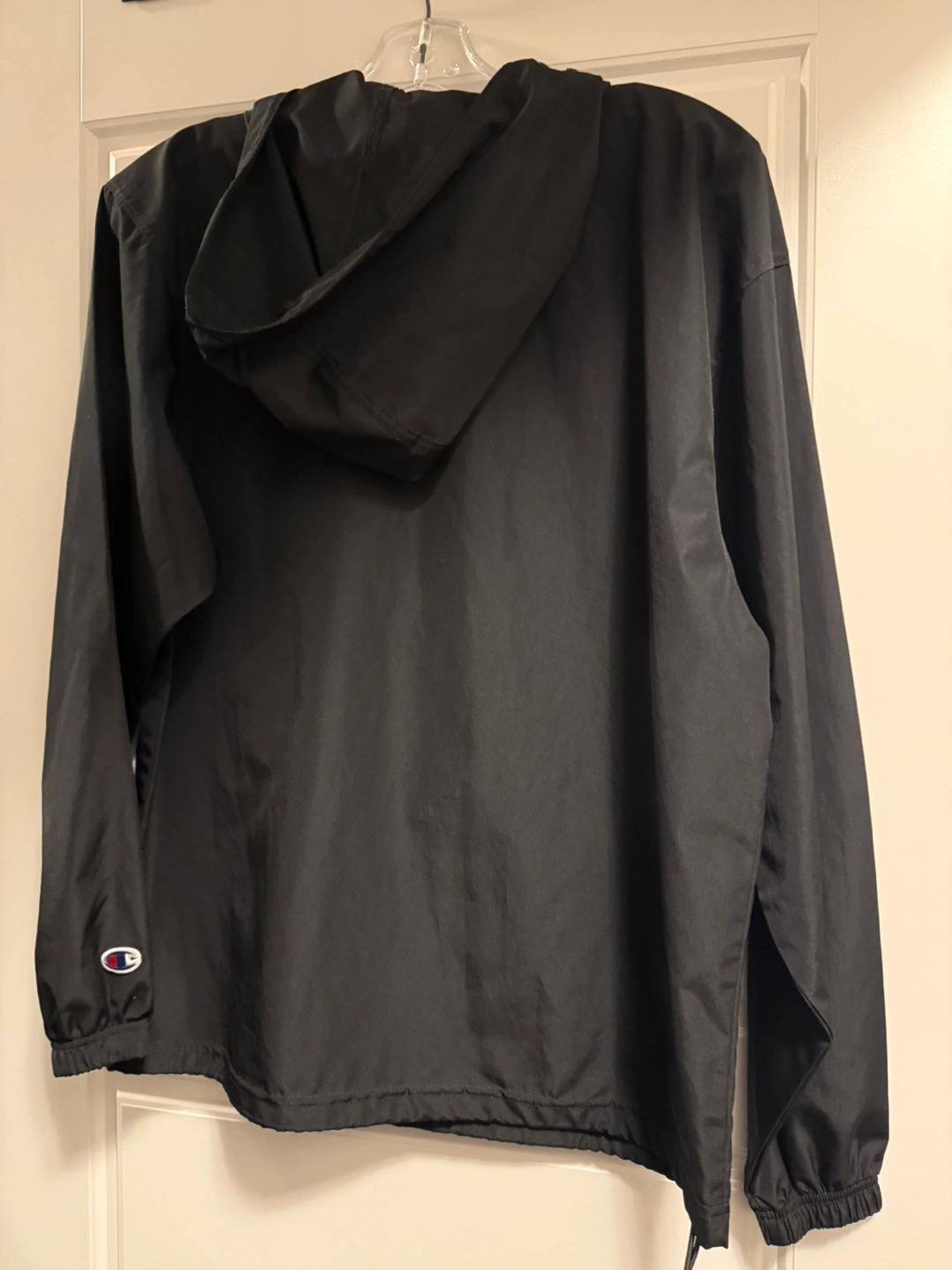 Black Champion pullover jacket. Adult Size small. Features a half-zip closure and a hood.
