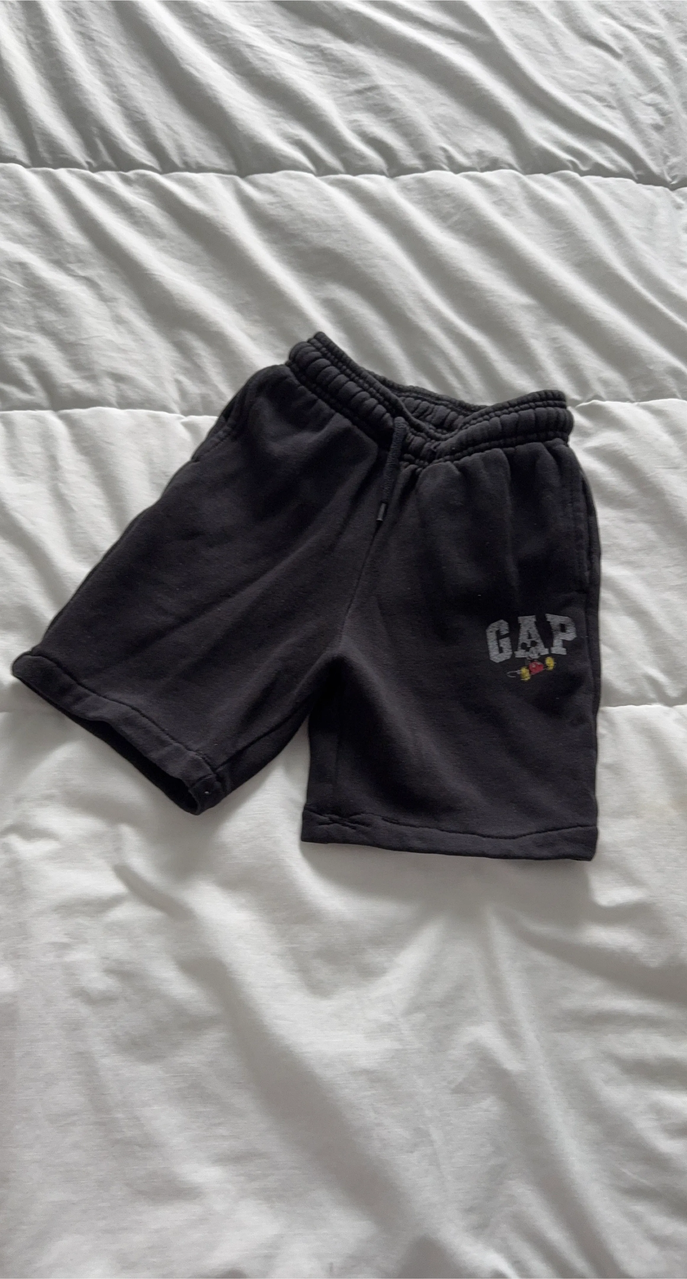 Black GAP sweat shorts featuring a small Mickey Mouse graphic. These shorts have a comfortable elastic waistband with a drawstring. Made from a soft cotton blend material.