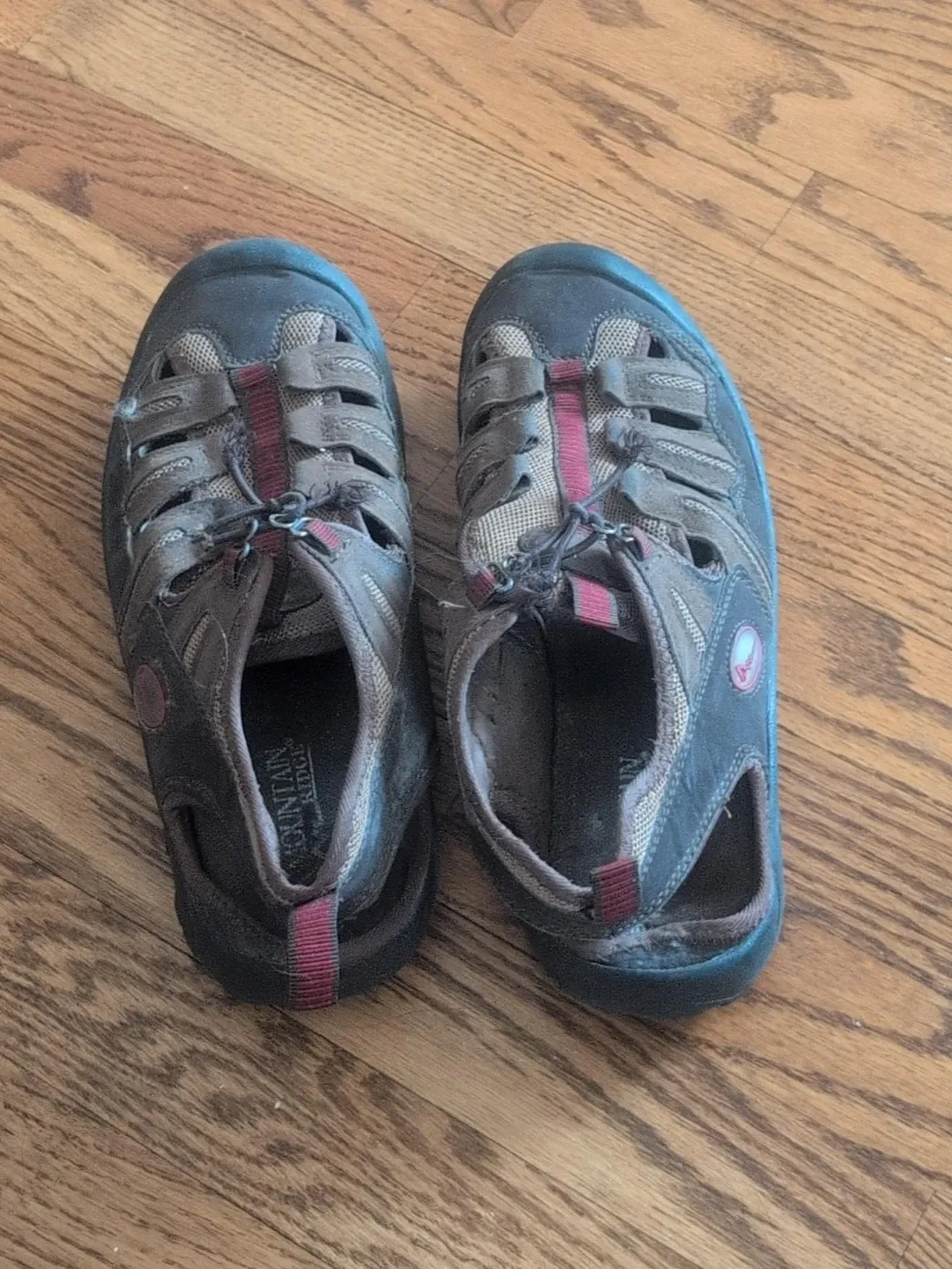 Mountain Ridge water sandals in a brown and grey colourway. These sandals are great for outdoor adventures. Features a bungee cord lace system for a secure fit.