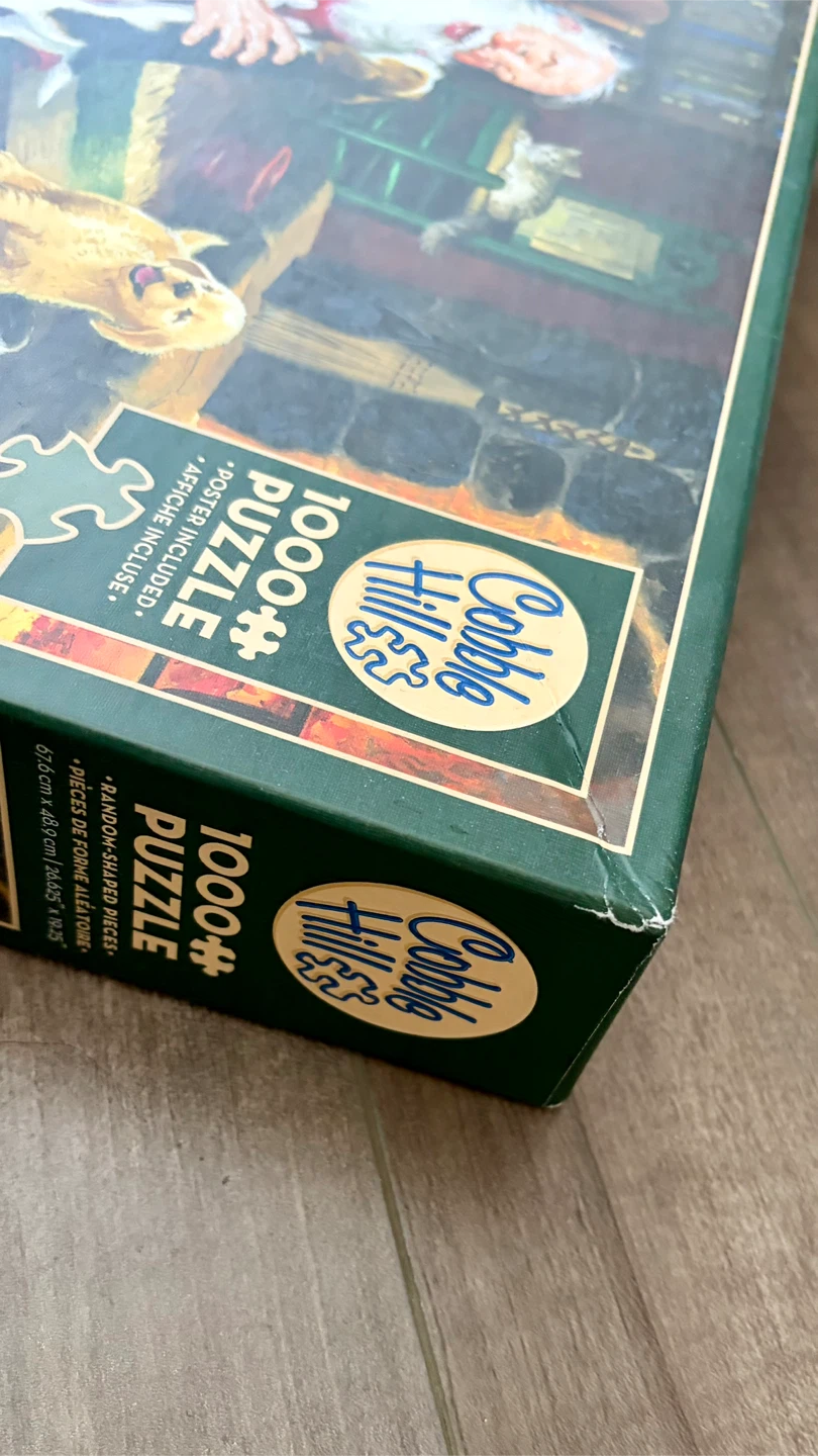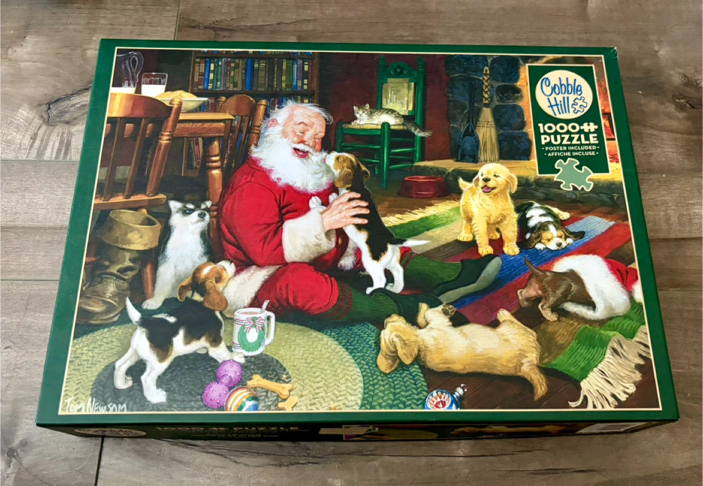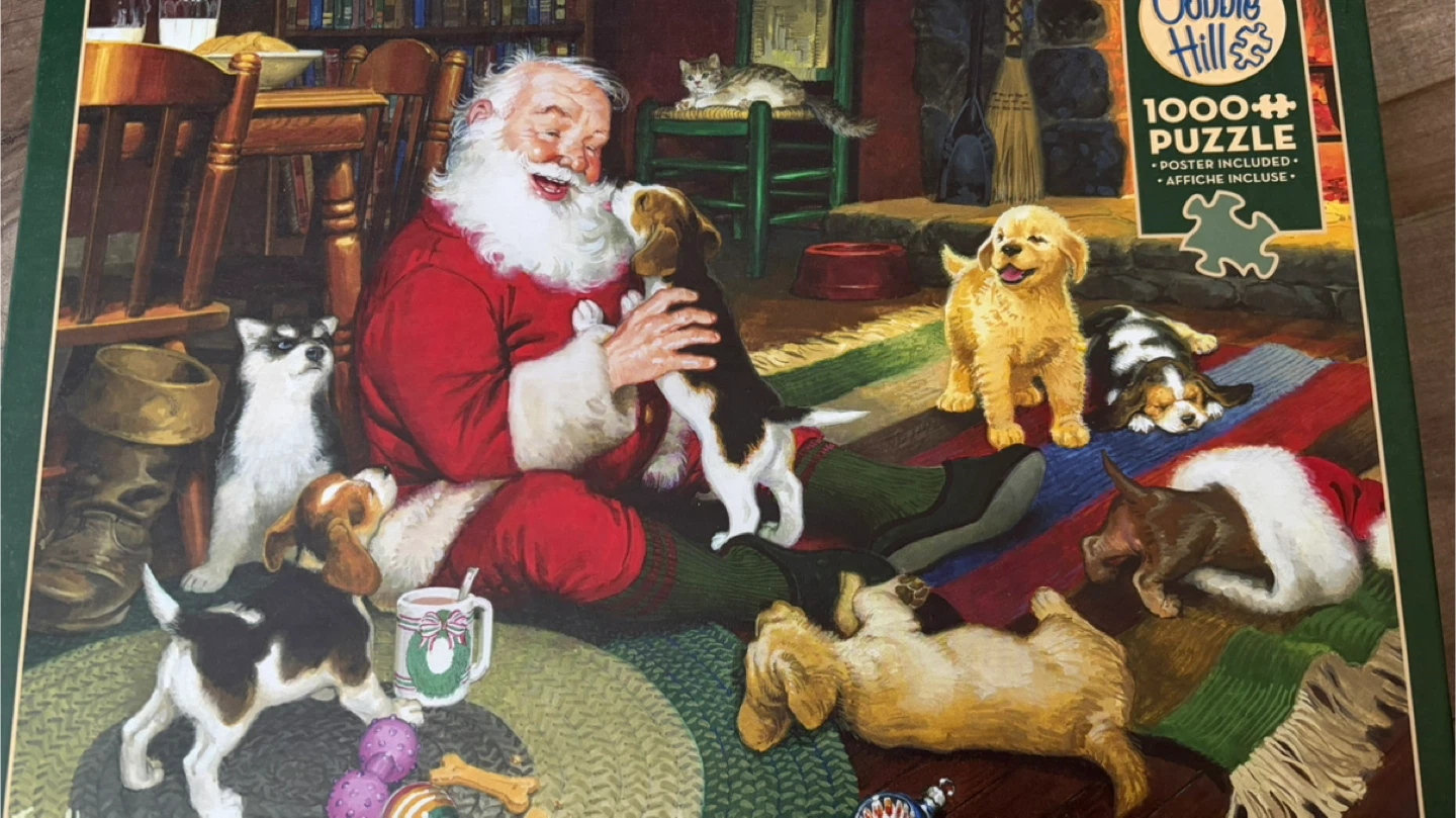 1000-piece puzzle featuring Santa with playful puppies