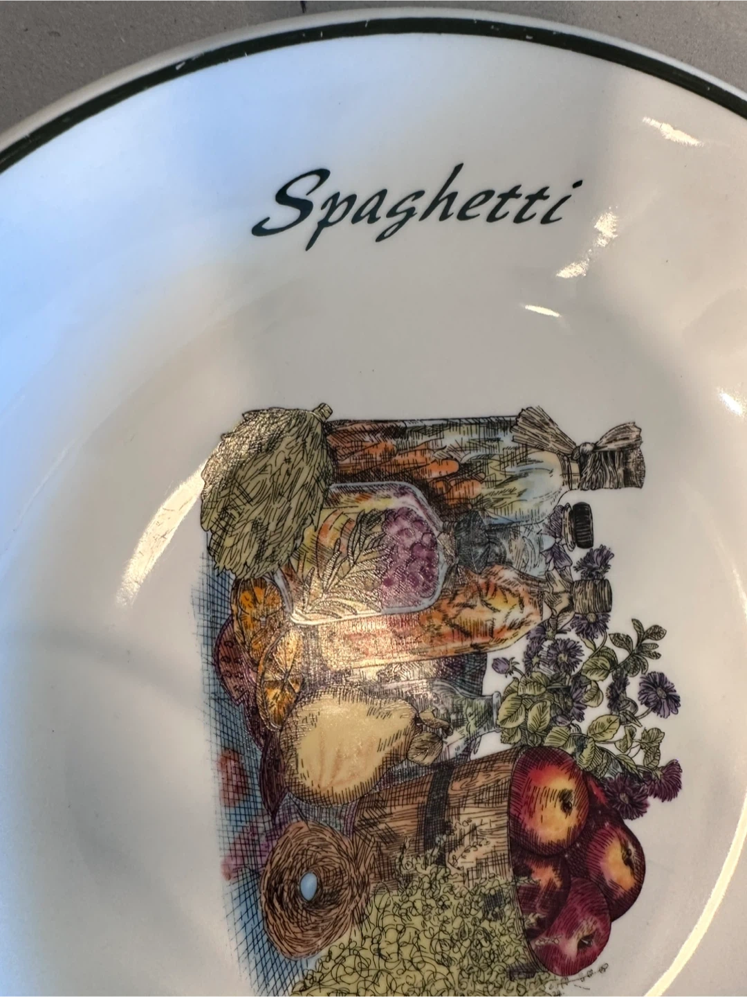 A white ceramic bowl featuring a charming Italian-themed illustration of pasta ingredients. It has 'Pasta' and 'Spaghetti' printed around the rim. This bowl is perfect for serving your favourite pasta dishes!