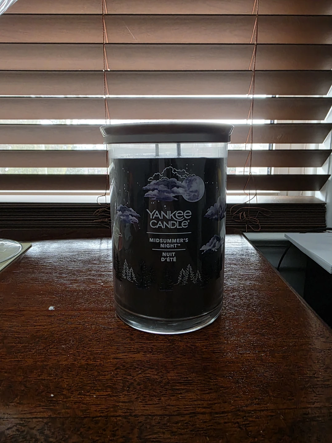 Brighten up your space with this Yankee Candle Midsummer Night large jar candle. The candle is in used condition, it appears to have a good amount of burn time remaining. Escape into the night with an intoxicating and masculine blend of musk, patchouli, sage and mahogany cologne.