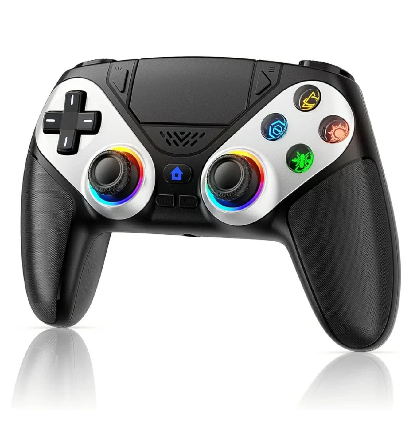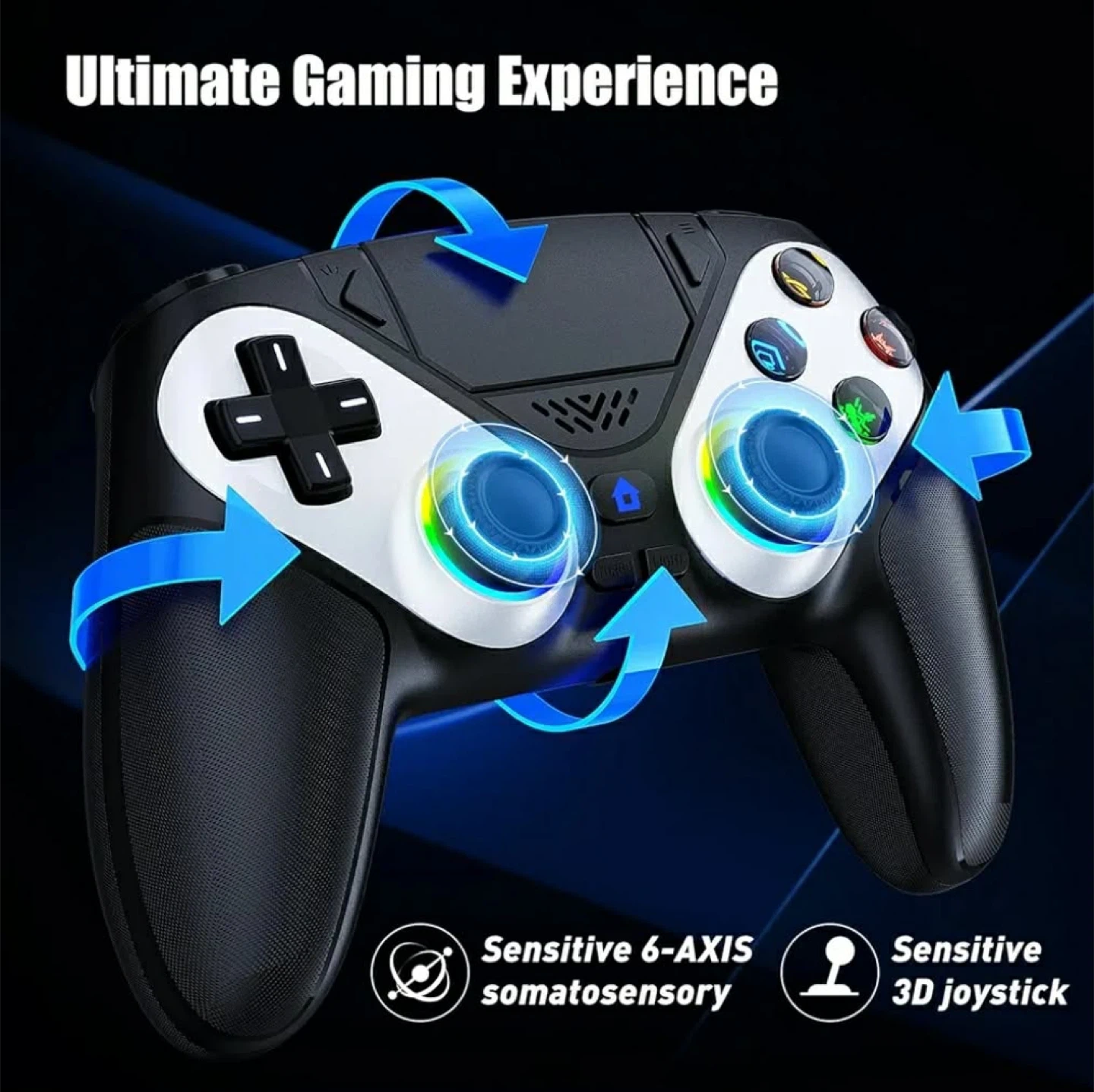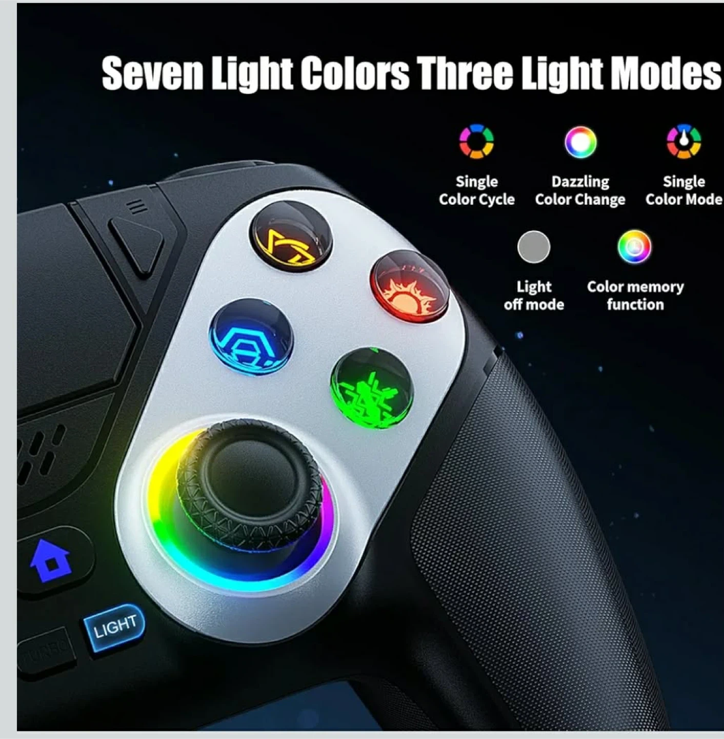 This multifunctional gaming controller offers an ultimate gaming experience. It features dual motor vibration feedback and sensitive 6-axis somatosensory. The controller supports seven light colours and three light modes, plus a colour memory function. It also has a 3.5mm headphone jack and a USB charging port.