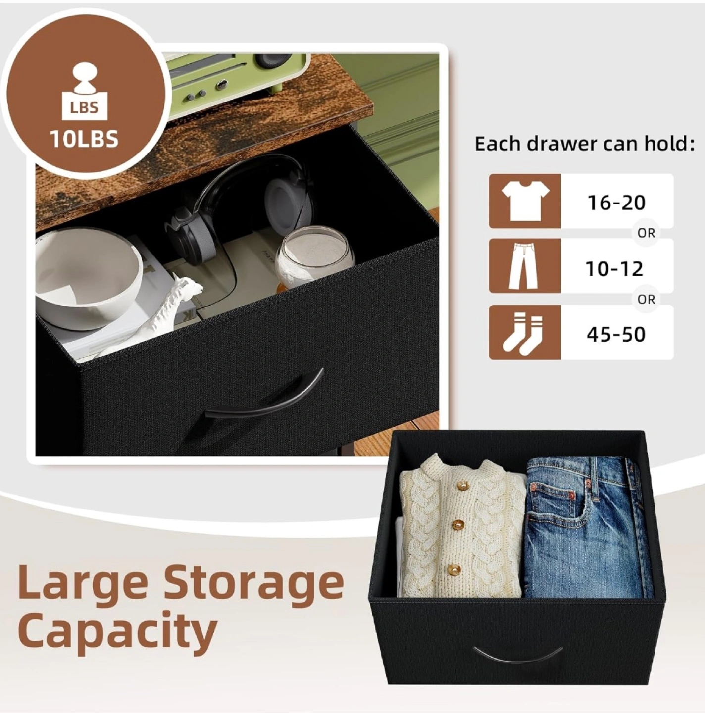 - Each drawer can hold 16-20 T-shirts, 10-12 pairs of pants, or 45-50 pairs of socks