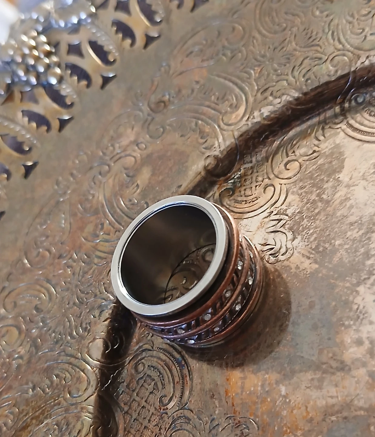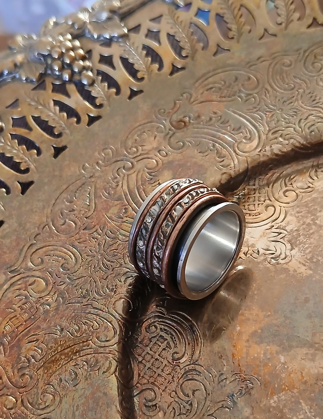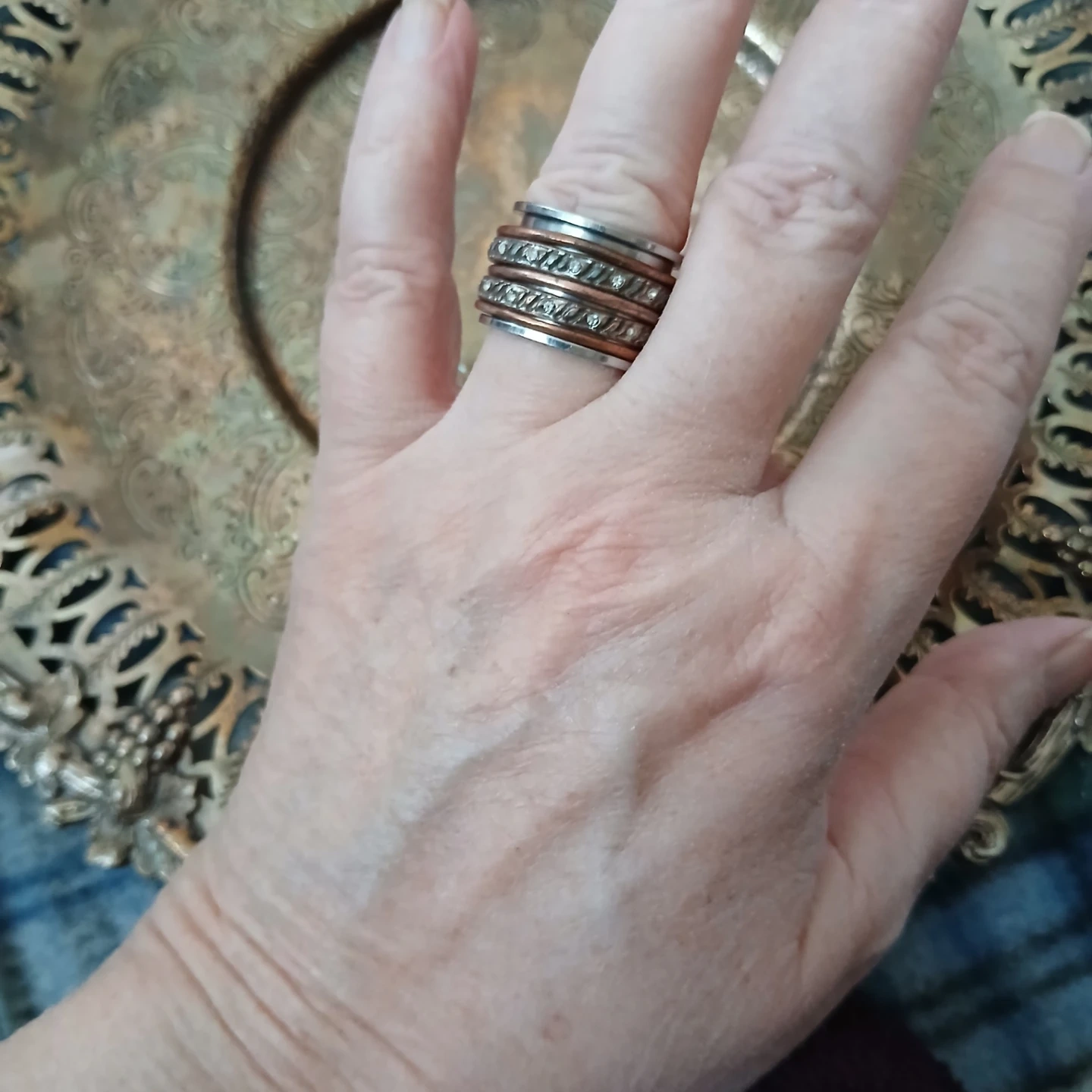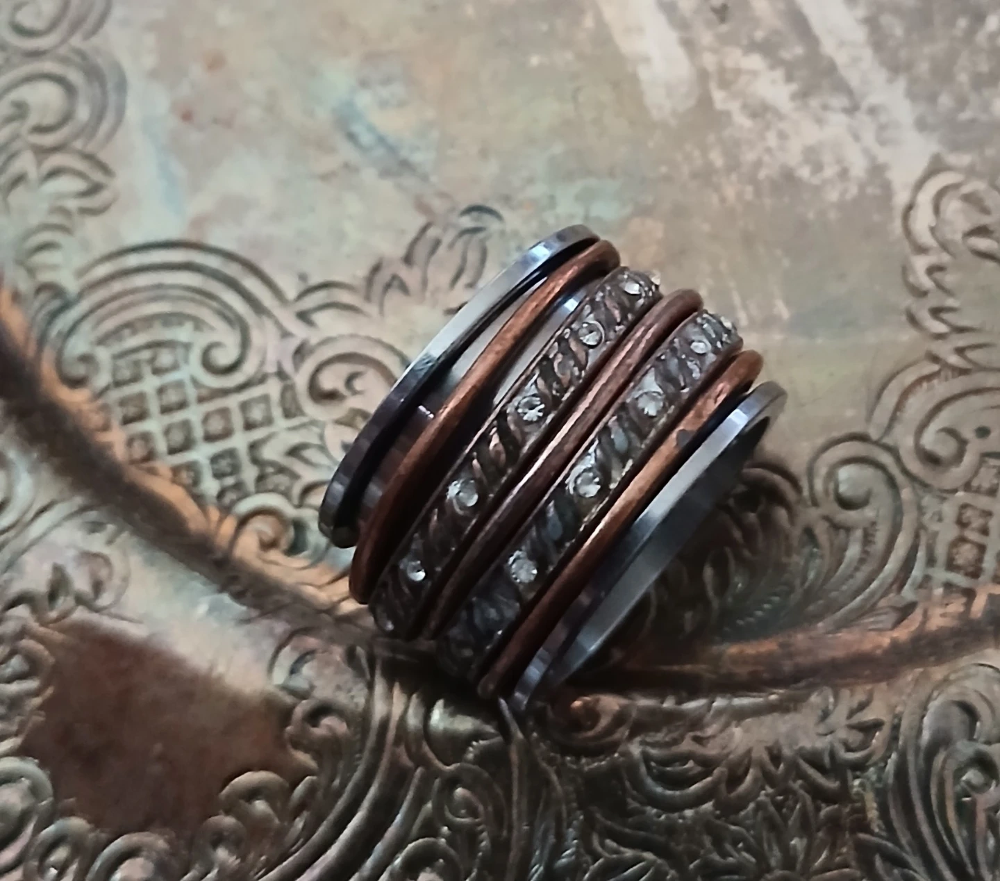 This Spinner ring has a multi-band design. It's made with a combination of copper-toned bands and bands with clear rhinestones. The outer bands are a dark grey metal.Size 6 1/2-7