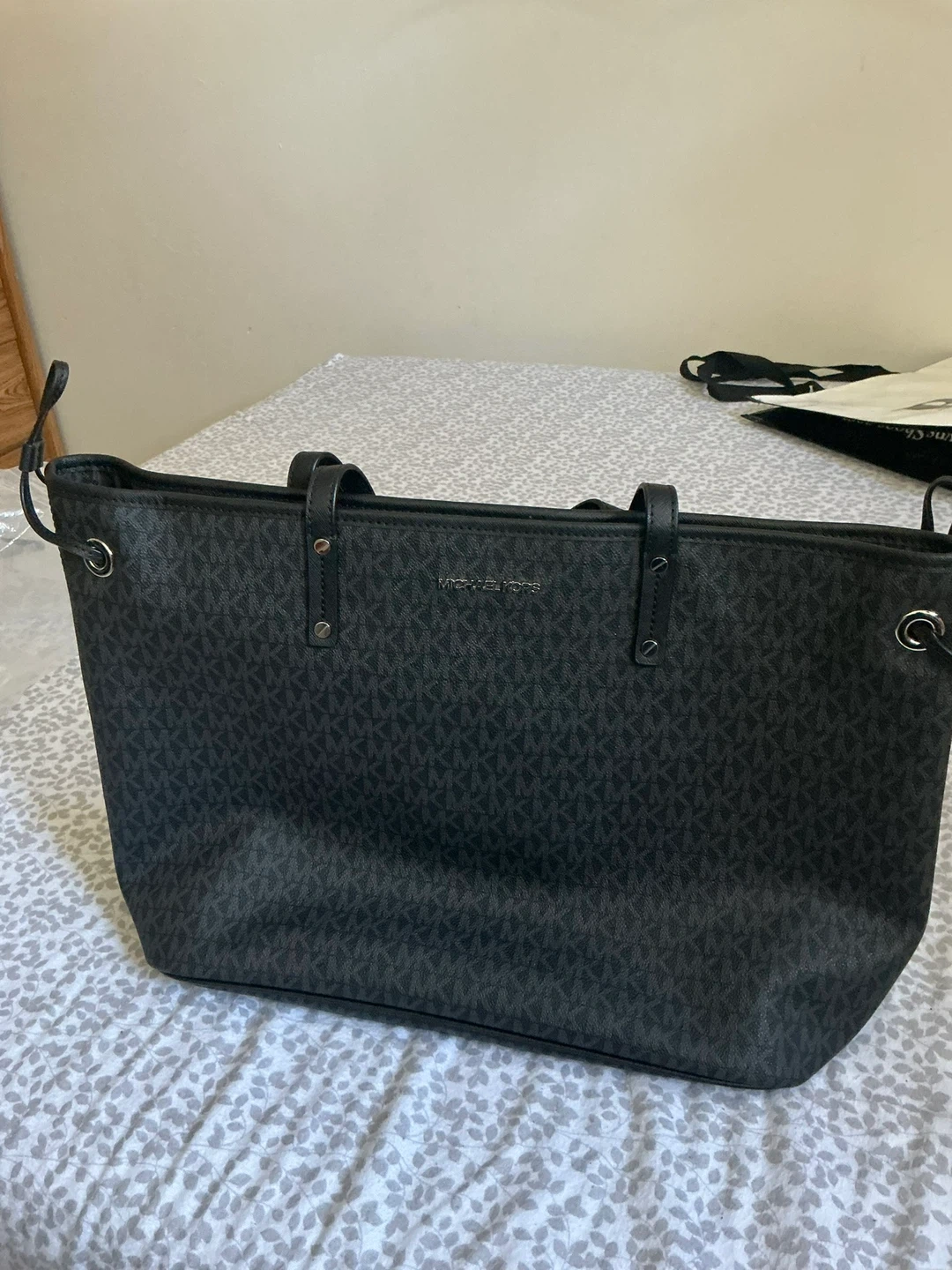 This is a Michael Kors tote bag with a signature "MK" pattern all over. It's black with darker grey logos. It has dual top handles and adjustable side ties. It's a spacious bag, perfect for everyday use!