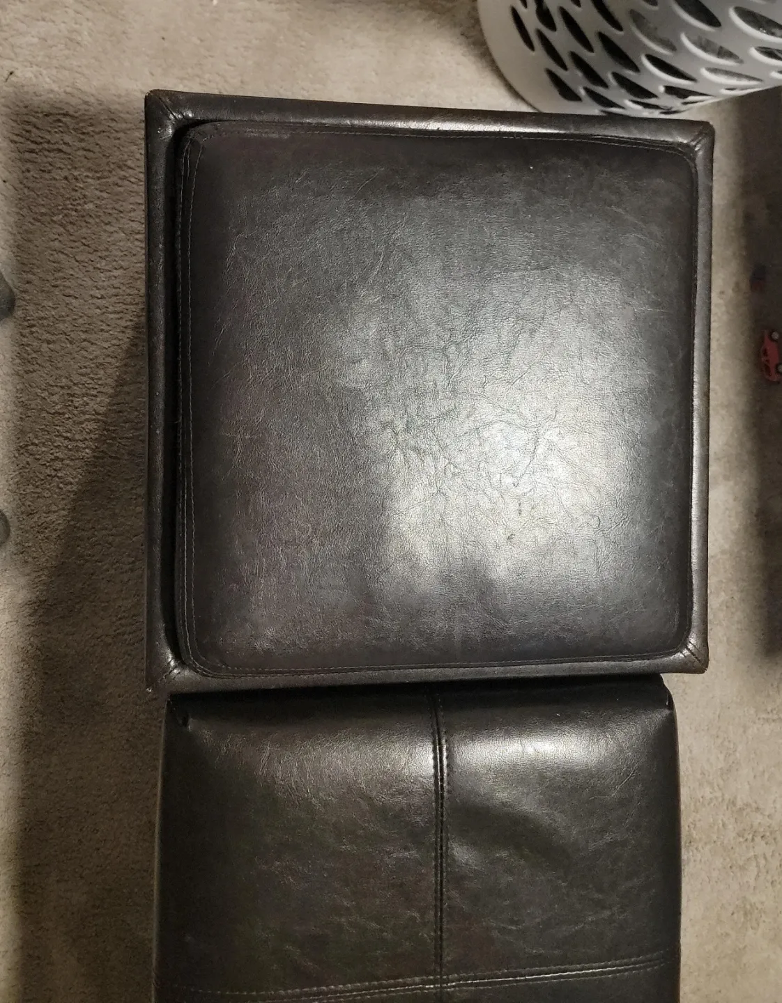 This storage ottoman is upholstered in dark brown faux leather. It's a great place to store extra blankets or magazines. This would be useful for organizing living room clutter.