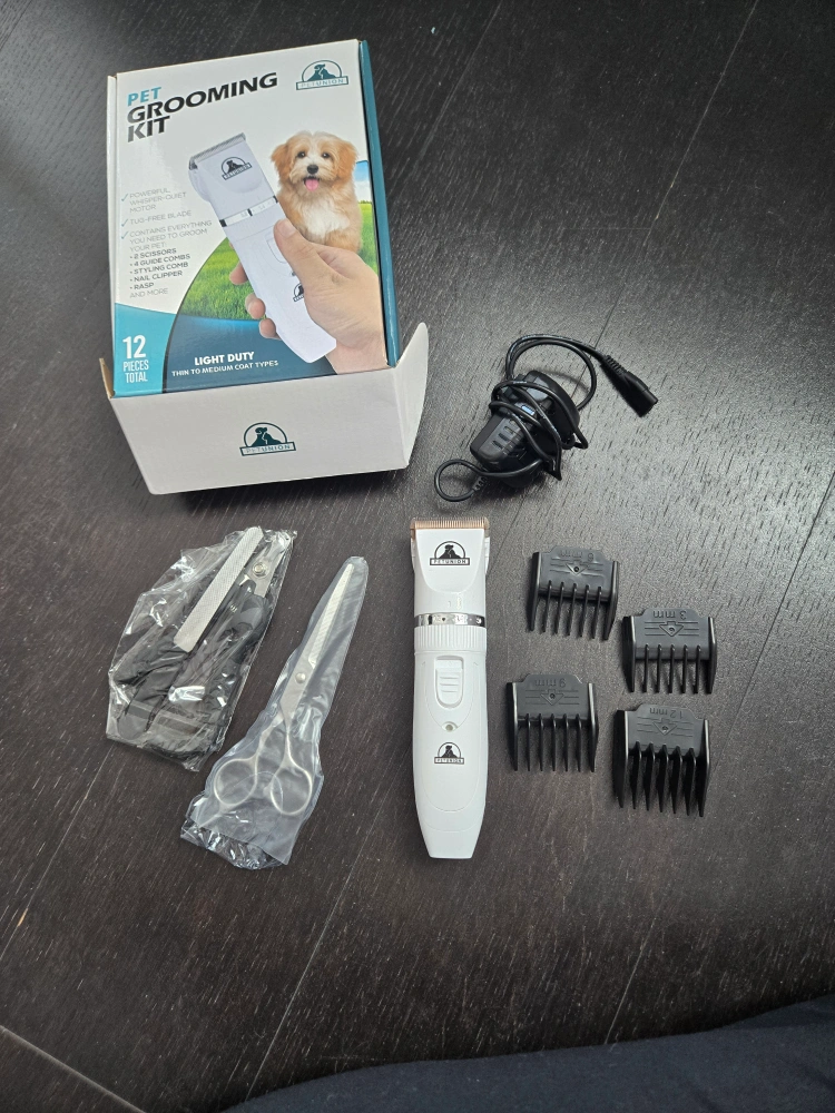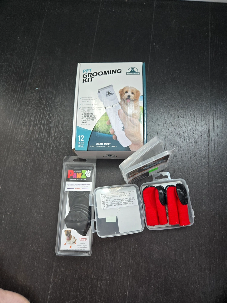 Petunion light duty pet grooming kit. Includes rechargeable hair shaver with 4 guide combs, charging cable, 1 pair of scissors, 1 nail clipper, and file - as shown in picture. Also New 12 Paws booties and 4 Goo-eez booties.
