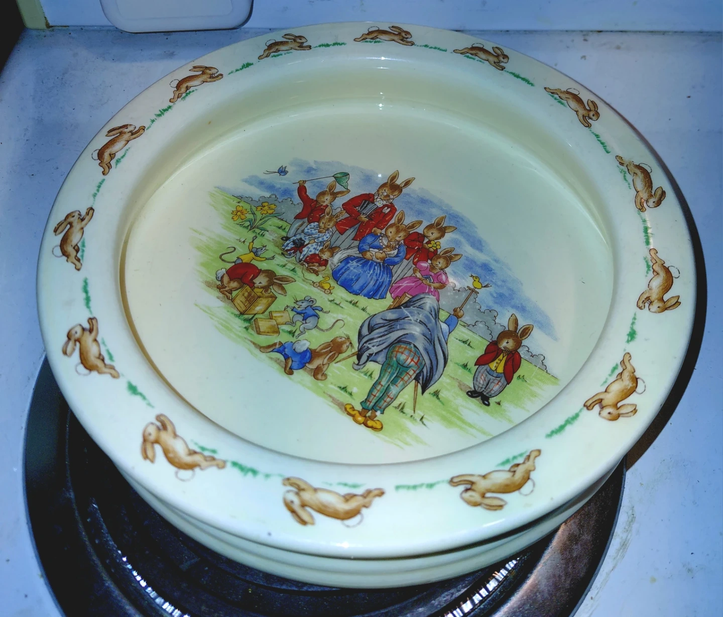 Selling a vintage Peter Rabbit bowl with a charming design! It features a delightful scene with Peter Rabbit and his family, surrounded by a border of adorable bunnies. A lovely piece for any collector or Peter Rabbit fan!