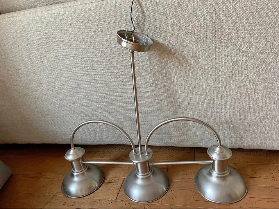 Brushed nickel 3-light ceiling fixture. Features 3 downward facing shades. Perfect for kitchens, dining areas or over an island.