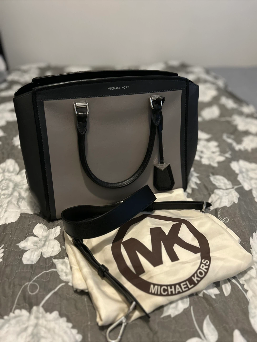 Looking to sell this Michael Kors satchel leather bag! It's a stylish grey and black colour. Comes with the original dust bag to keep it protected. With side strap.