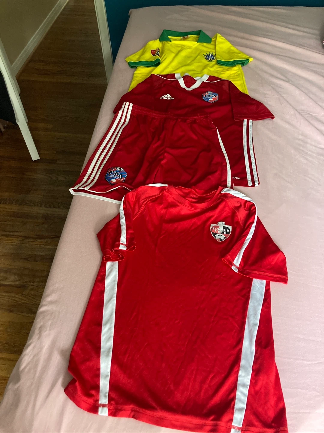Selling a bundle of soccer clothes. Includes: Soccer set (shorts and jersey) 2 jerseys 6 pair of soccer socks Jerseys and shorts are size 13-14 youth Soccer socks are size 13-15 youth Photo 2 is showing the same clothes, just showing the back of the clothes. All in great condition Take everything for $8!!