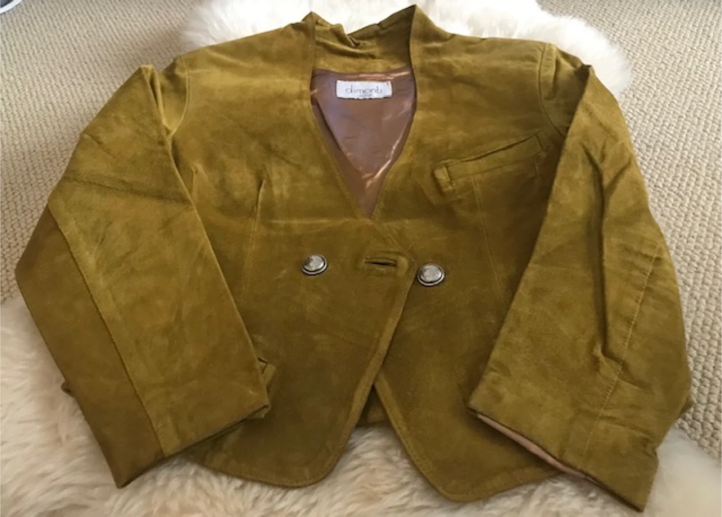 Selling a suede vintage jacket in a unique mustard colour. It's a size small or XS and features a double-breasted design with stylish silver buttons. The jacket is in great condition and perfect for adding a touch of vintage flair to your wardrobe. Can meet up in area close to Breka on Davie or downtown skytrain. You can verify then decide, this would fit best a petite person. Was never worn.