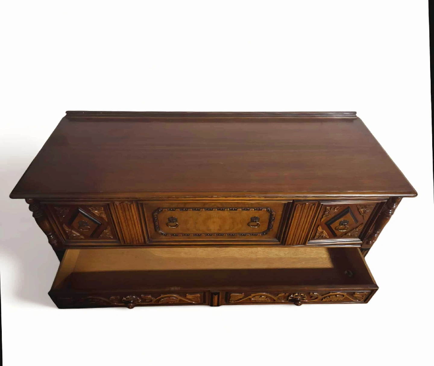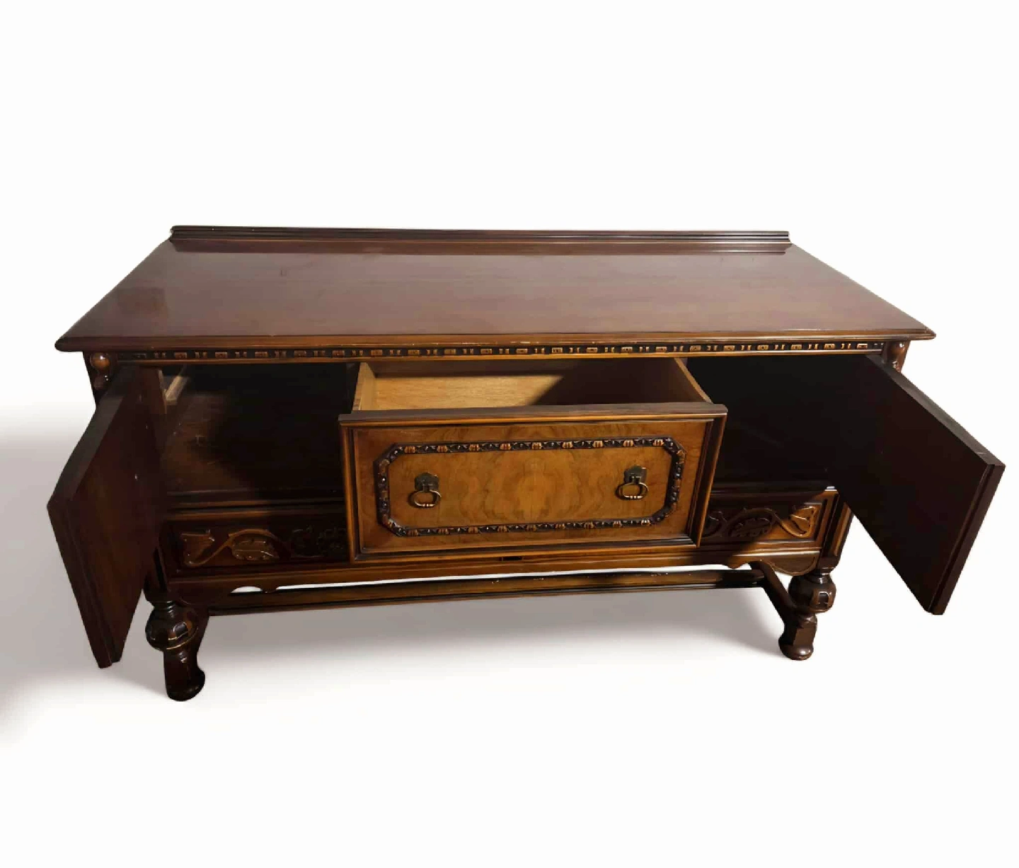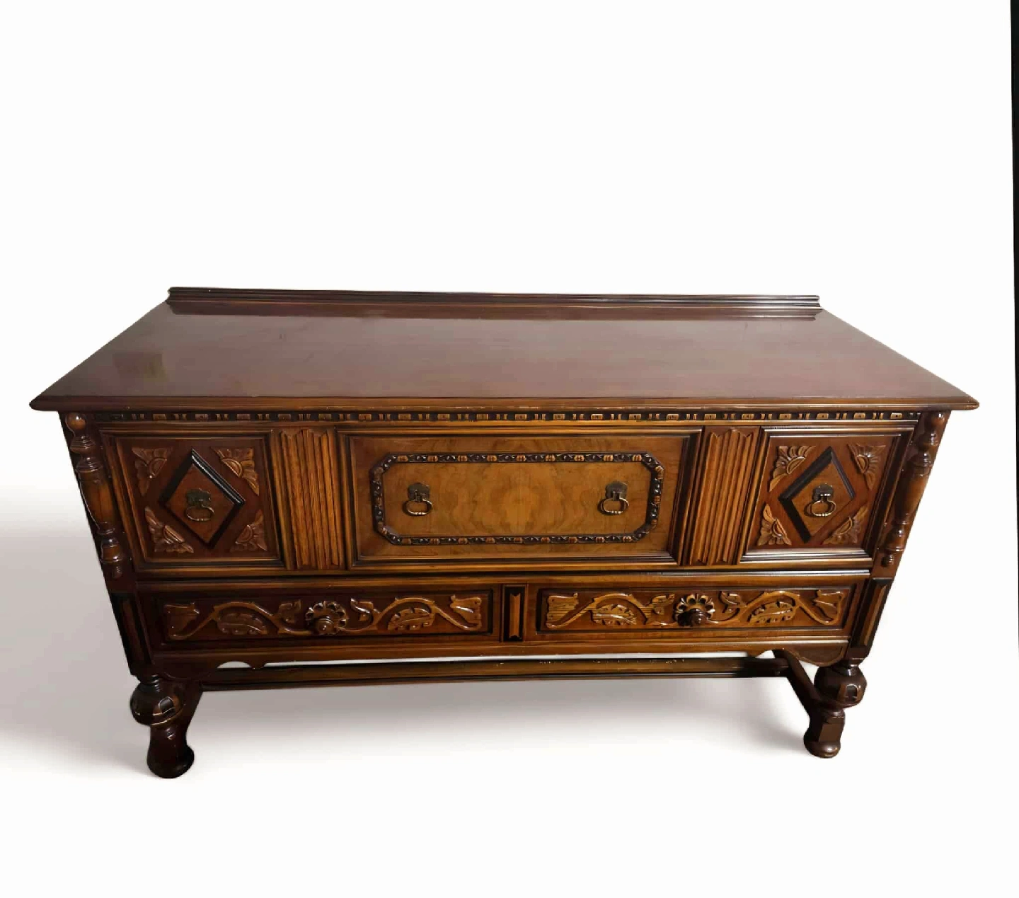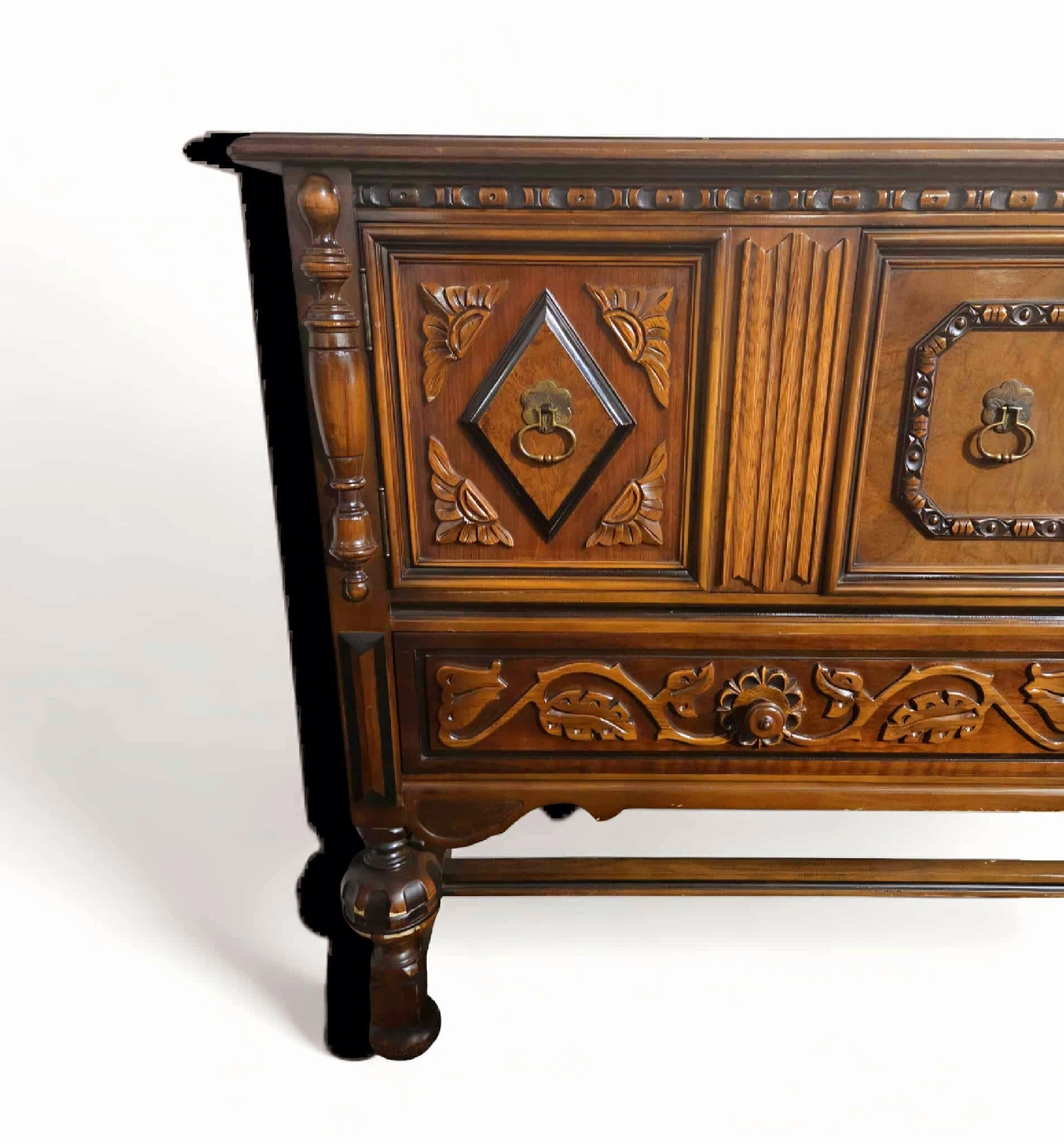 Antique Solid Walnut Brutalist Buffet With Storage (Delivery Available) Vintage Jacobean style heavy carved solid oak sideboard featuring two large cabinets and two large drawer. Dimensions: 60"(w) × 21"(d) × 36"(h) Pick up in downtown Vancouver or delivery may be arranged for a reasonable fee. Tags: retro vintage antique 1910s 1920s 1930s 1940s 1950s Victorian solid wood mahogany tiger oak sideboard server buffet credenza cabinet TV bench media stand restoration hardware jirdans film TV set dec props Gothic brutalist living room dining room
