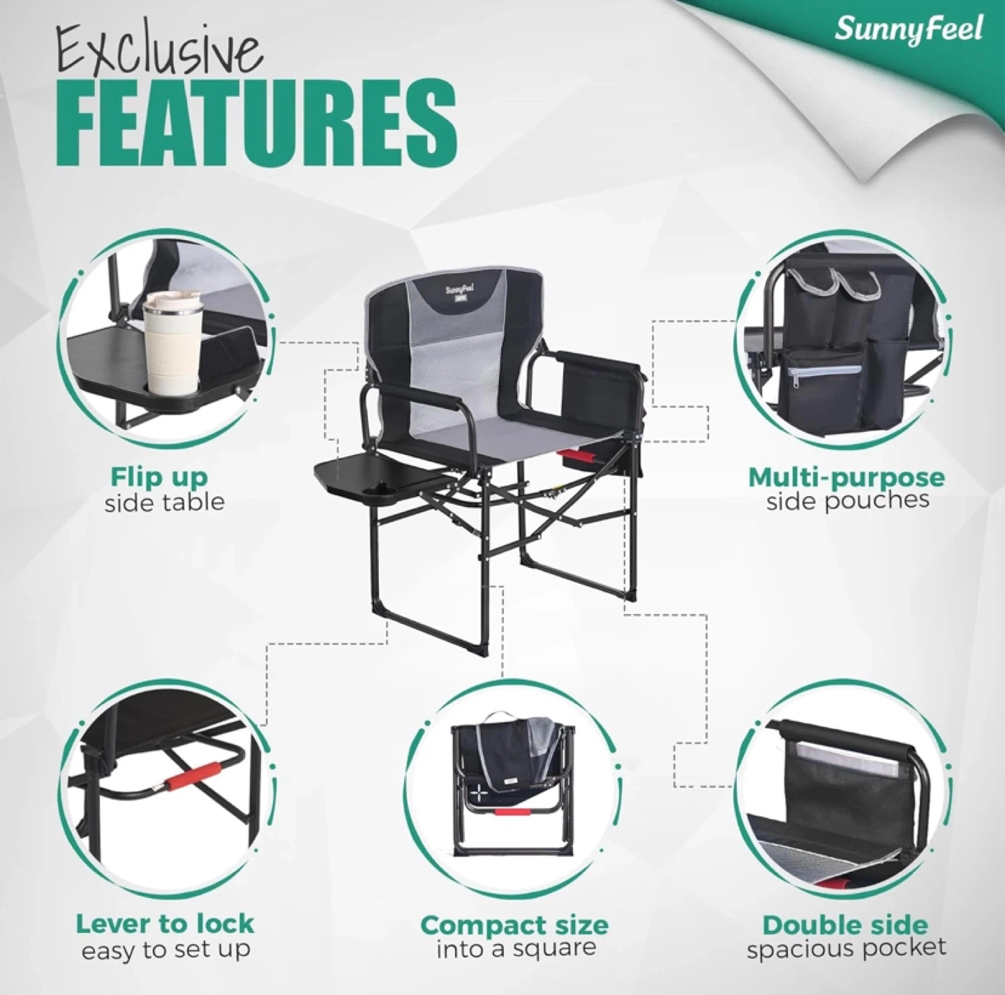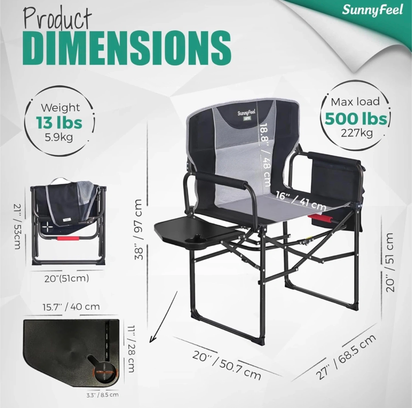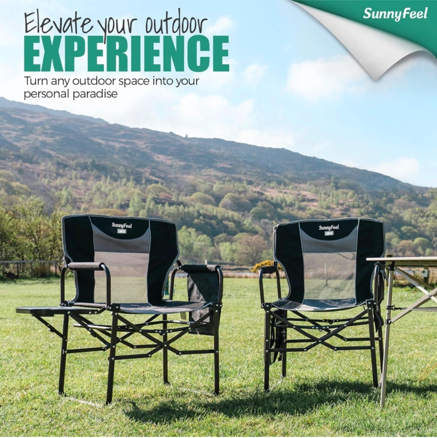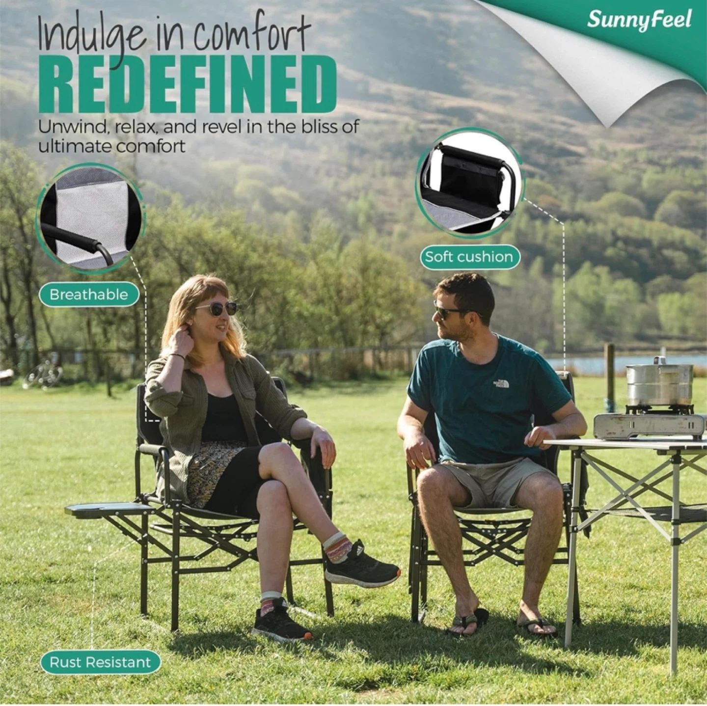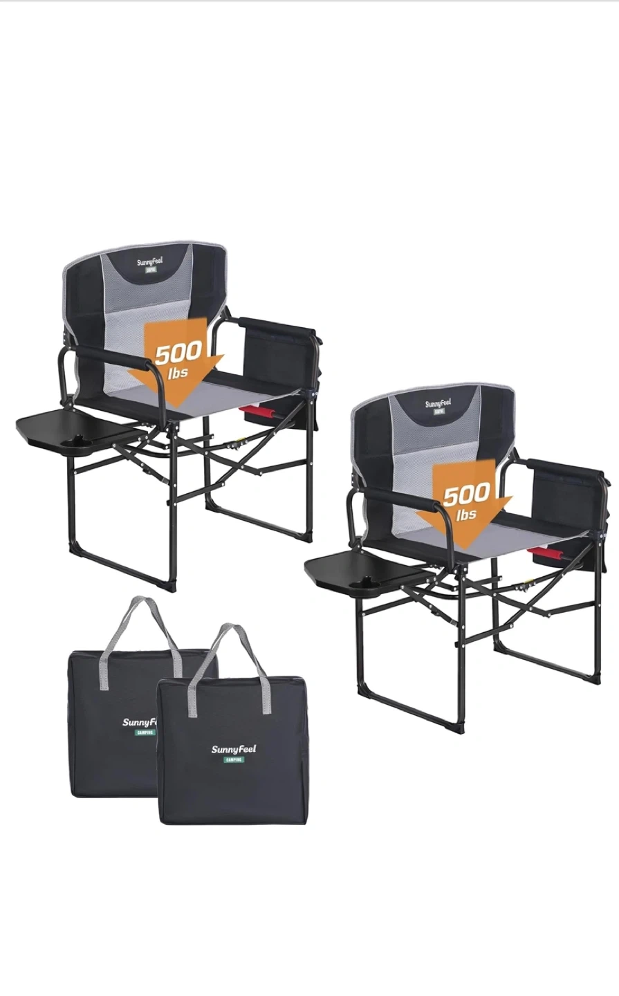 Get ready for your next outdoor adventure with this SunnyFeel camping chair! It's designed for comfort and convenience, featuring a handy side table and a breathable, soft cushion. It can hold up to 500 lbs. The chair is easy to carry in its compact carry bag. It's rust resistant, too!.