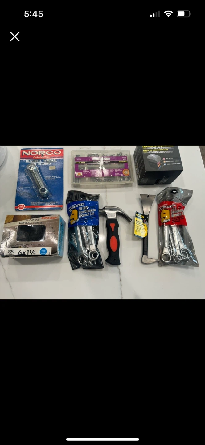Selling a Norco dumbbell wrench and an Ultra Steel 9-piece metric combination wrench set. Also included are Dura-Grip drywall screws (500, 6x1 1/4). As well hammer and more . Everything is available in picture except sold the blue pack of wrenches the red pack is still available message me for individual prices or 15for everything in picture