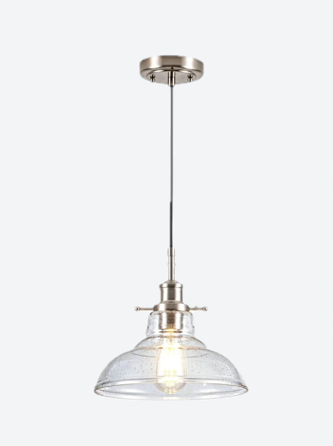 This is a stylish pendant light with a clear seeded glass shade and a brushed nickel finish. It would be a great addition to any kitchen or dining room